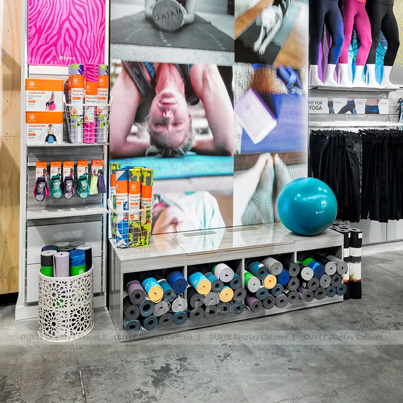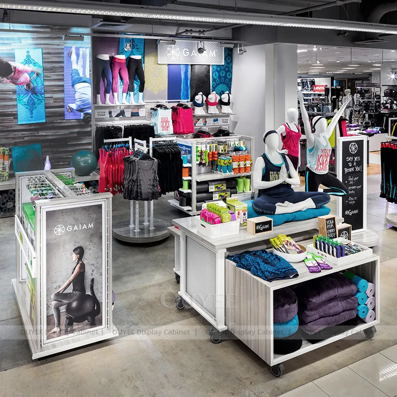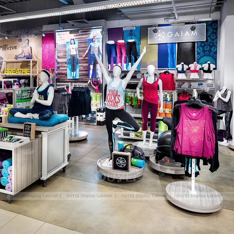 OUYEE develops Activewear Yoga Mannequin Round Table Display for sporting goods stores, active lifestyle retailers, fitness shops, and performance-focused retail interiors. This custom display rack package helps stores organize apparel collections, folded garments, hanging presentation, and coordinated retail stories while keeping the fixture language clear and project-ready for commercial rollout.