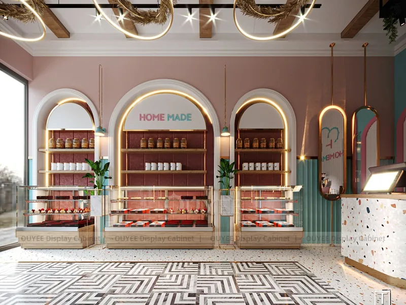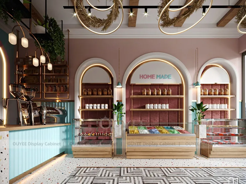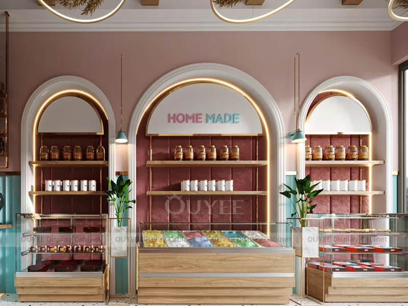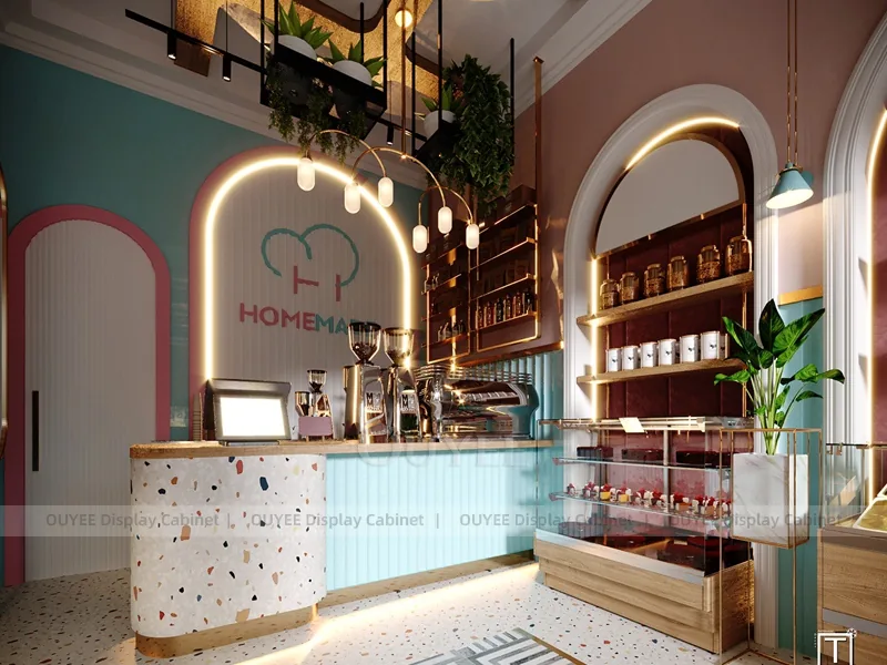 OUYEE can customize this model with custom color retail finishes, durable counter and storage modules, and integrated signage and lighting positions. Store owners can adjust size, finish, layout, logo panel, counter height, storage structure, service opening, pickup area, cup storage, equipment clearance, dessert display depth, front presentation area, menu areas, cup storage, topping display, lighting position, counter depth, and brand logo details to match the final shop drawing.