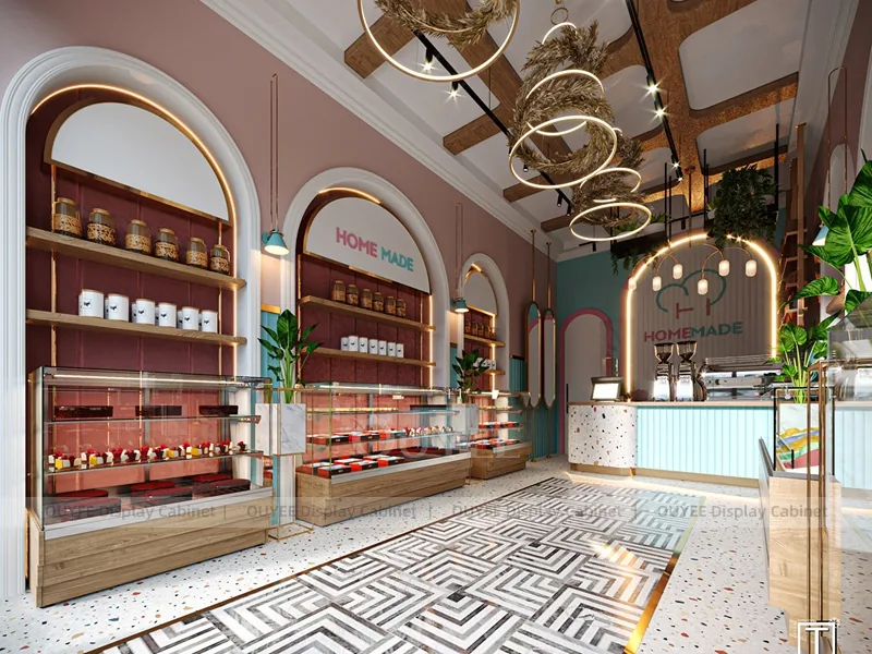 This design uses bakery beverage layout with front display capacity, service access, and warm product presentation. It gives the store clear ordering, pickup, display, storage, and replenishment zones so staff can work smoothly during busy drink-service hours.