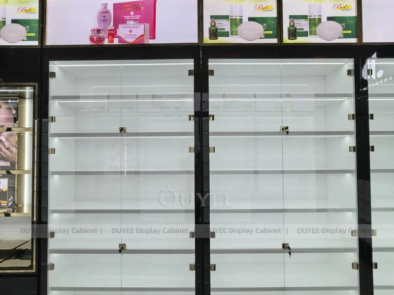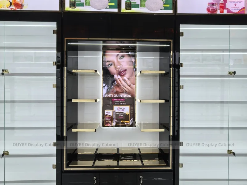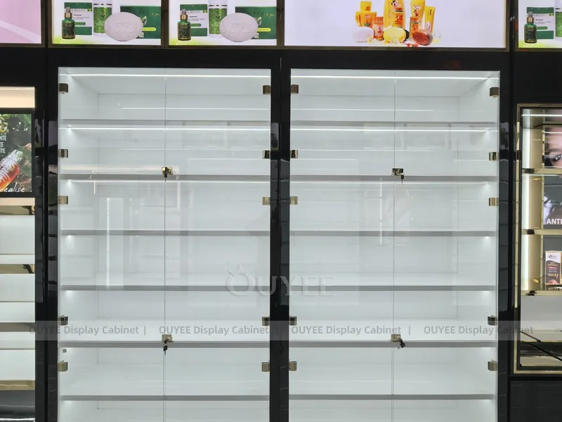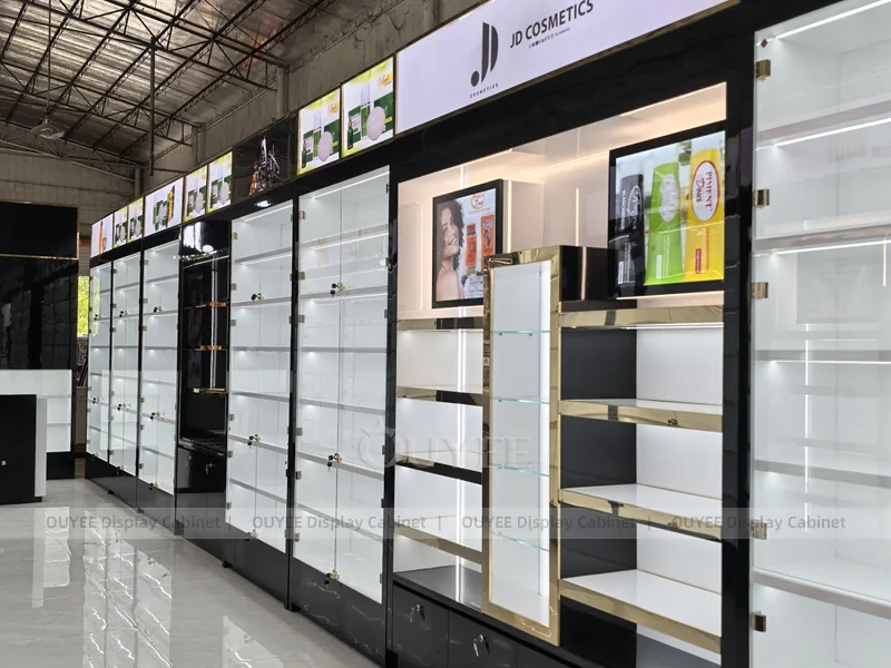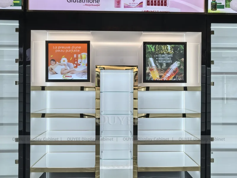 OUYEE can produce this model with commercial display panels, durable metal supports, tempered glass options, acrylic details, and integrated LED lighting. Dimensions, finish colors, shelf depths, light boxes, tester trays, logo panels, storage modules, and counter details can be adjusted to match the store plan and brand identity. Related inspiration is available across display shelves, wall display, display counter, and our store fixture manufacturing service.