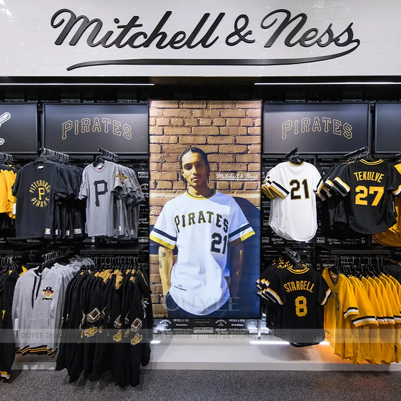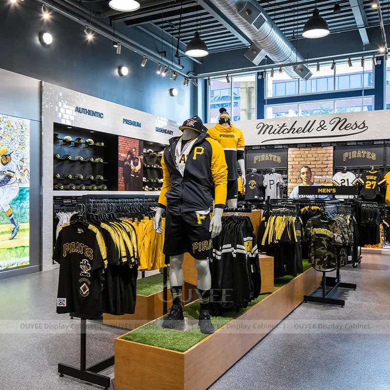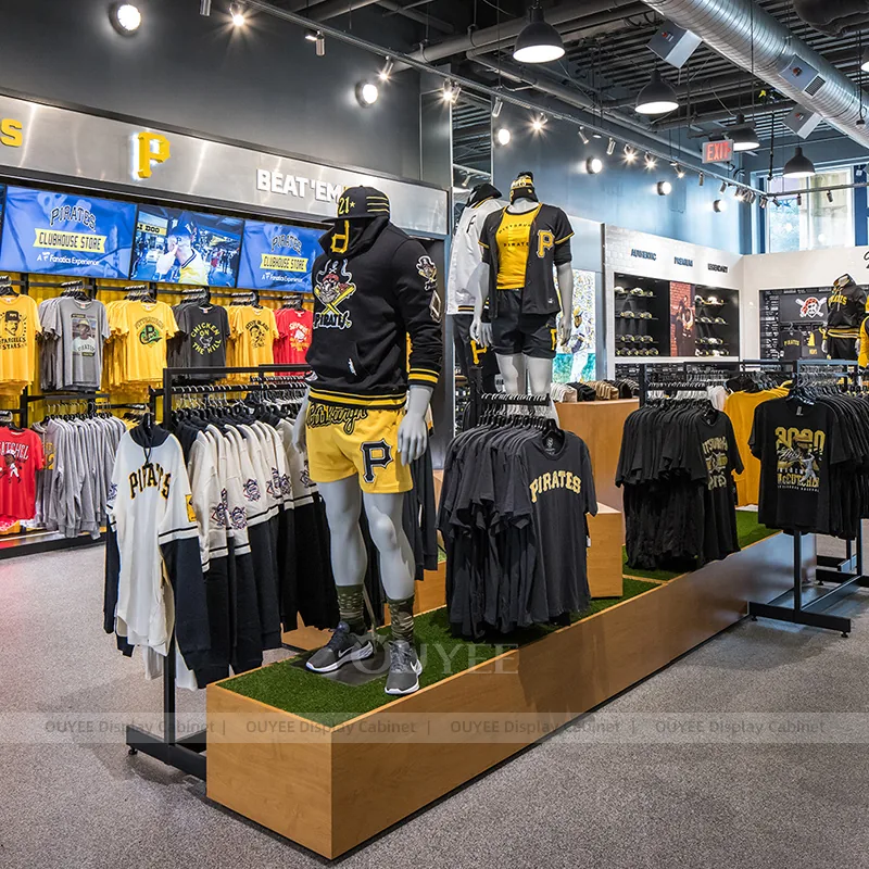 This configuration works well for stadium team stores, university fan shops, sports merchandise retailers, and branded event retail. It is suitable for stores that want custom display hardware, more coherent fixture language, and a practical combination of feature presentation, everyday stock holding, and shopper-friendly access.