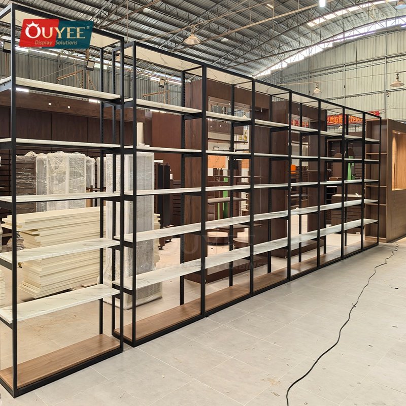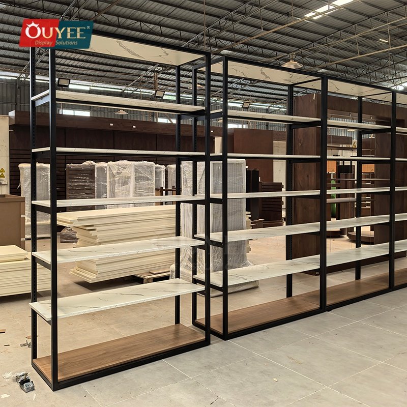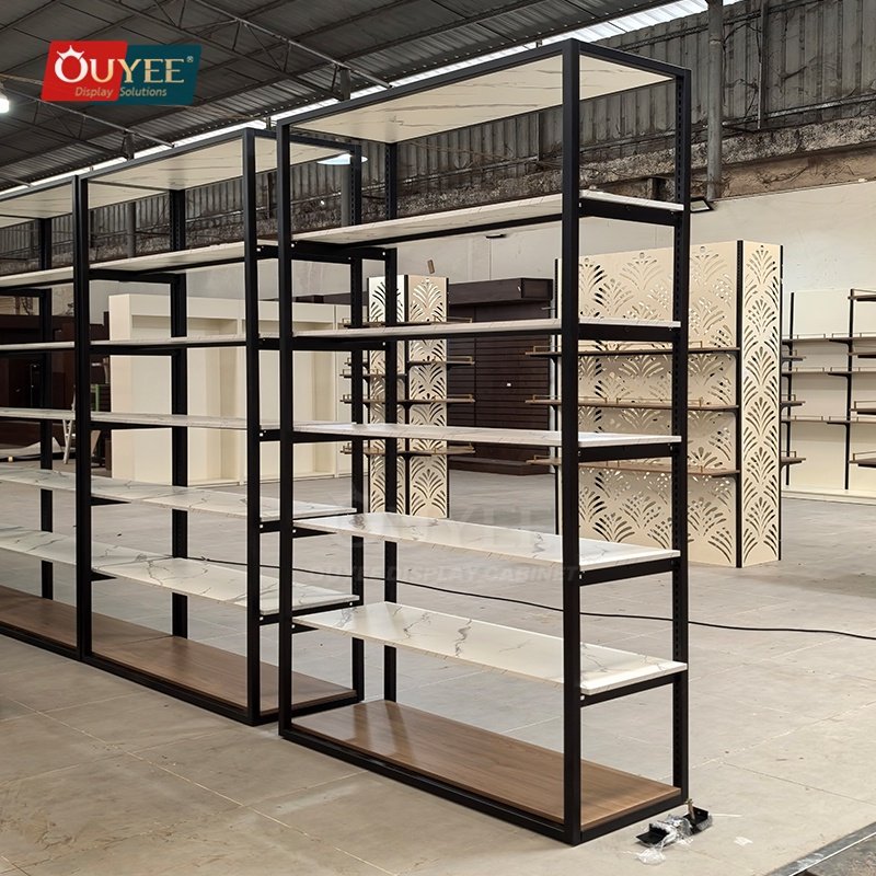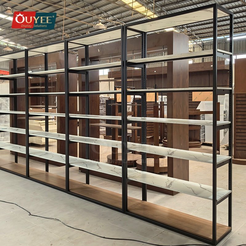 Built for specialty retailers, boutiques, branded chain stores, and high-traffic merchandising environments, the Black and White Marble Retail Shelf Rack gives retailers a more structured way to present merchandise, guide shopper attention, and keep display updates efficient across changing collections. For similar fixture references, you can visit our display shelves page, browse more store shelving displays, and review OUYEE production support on the manufacturing and materials pages.