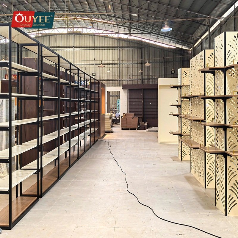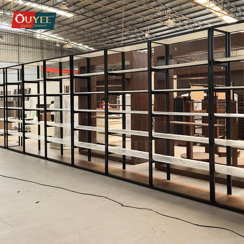 OUYEE can produce this model with metal framing. Depending on project needs, we can adjust dimensions, shelf spacing, accessory modules, finish tones, graphic areas, and lighting details so the fixture fits the brand language and the available floor plan. For related inspiration, you can also browse display shelves and our store fixture manufacturing capabilities.