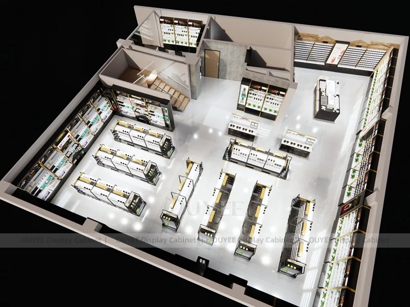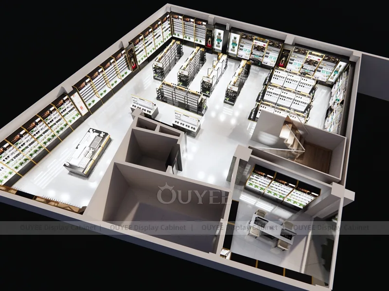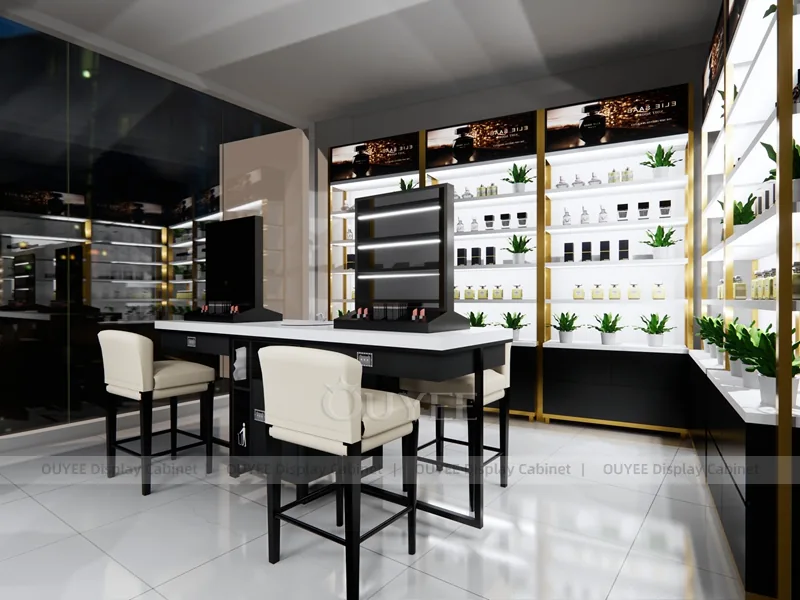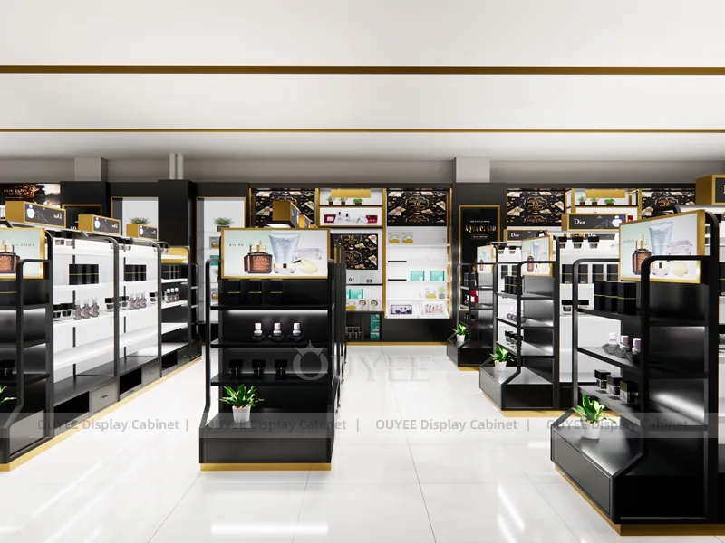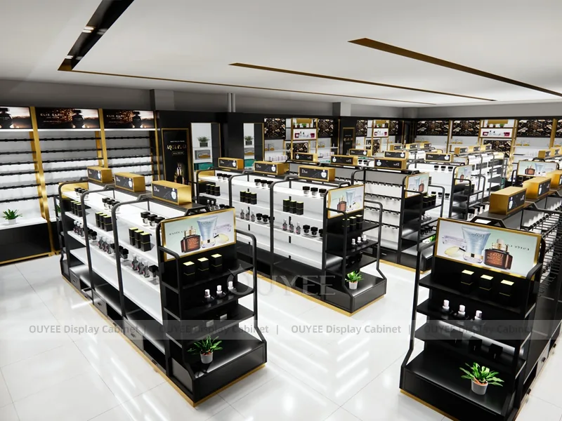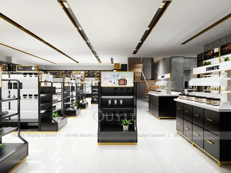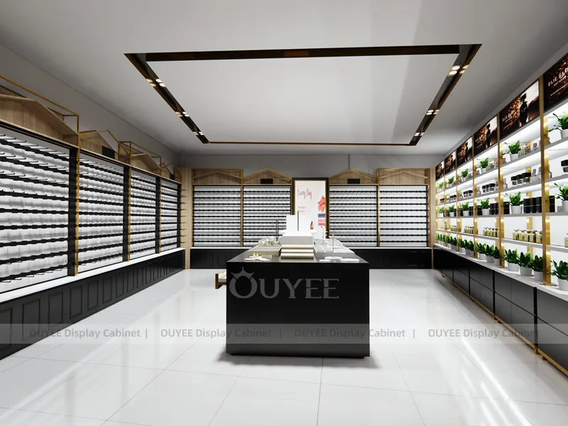 OUYEE can produce this model with black retail panels, durable metal supports, glass display areas, and integrated LED lighting. Dimensions, finish colors, shelf depths, light boxes, tester trays, logo panels, storage modules, and counter details can be adjusted to match the store plan and brand identity. Related inspiration is available across display shelves, wall display, display counter, and our store fixture manufacturing service.