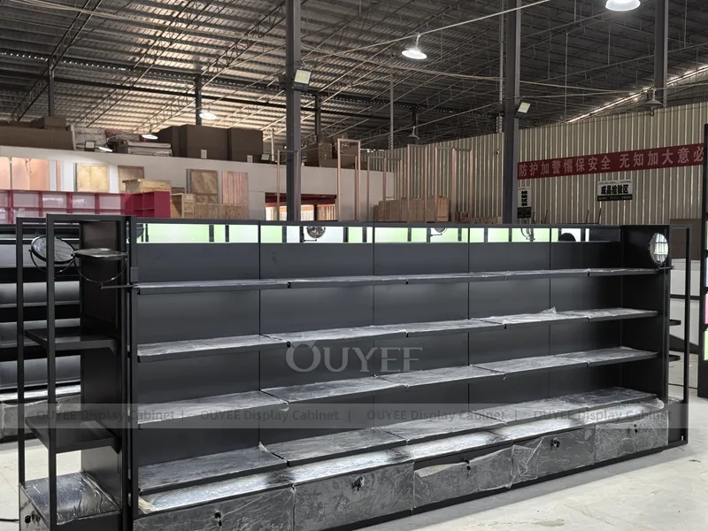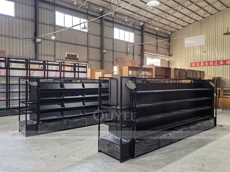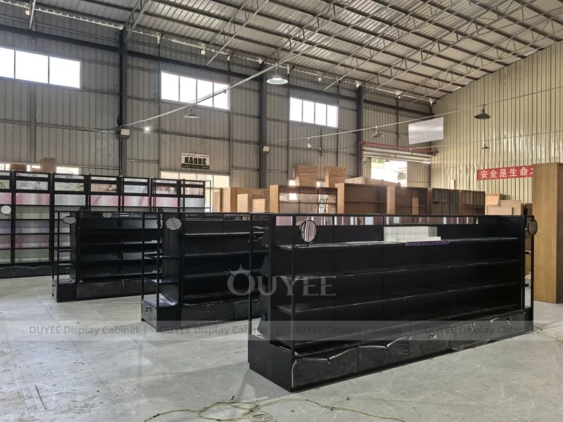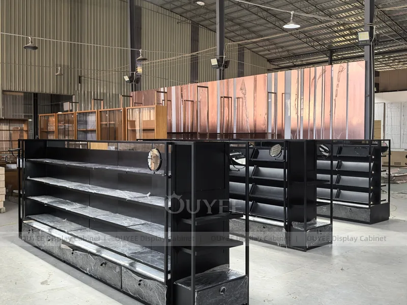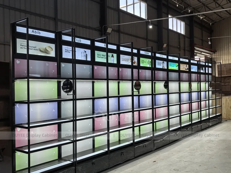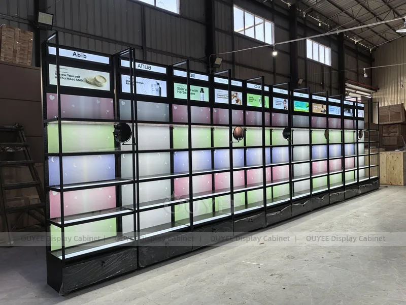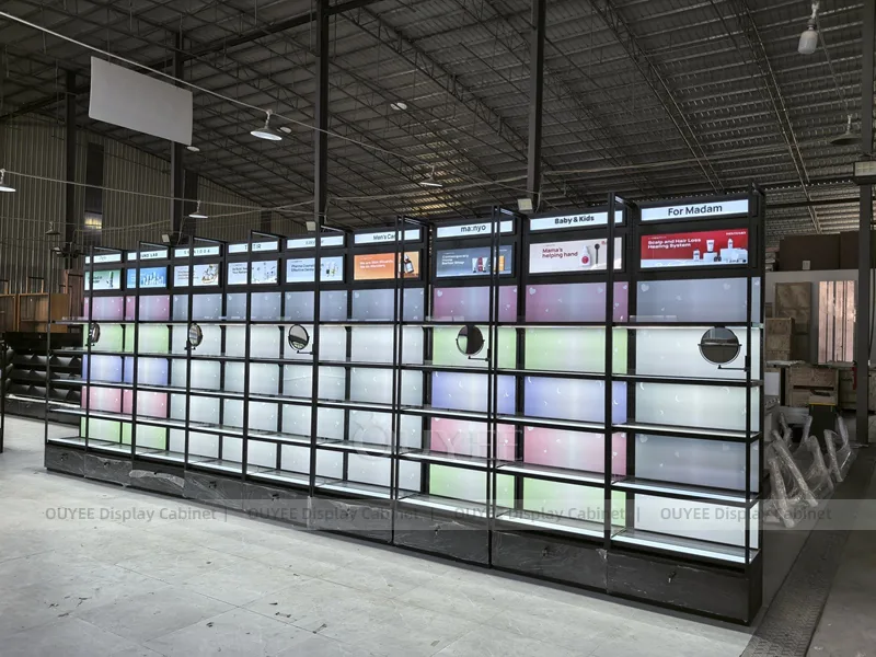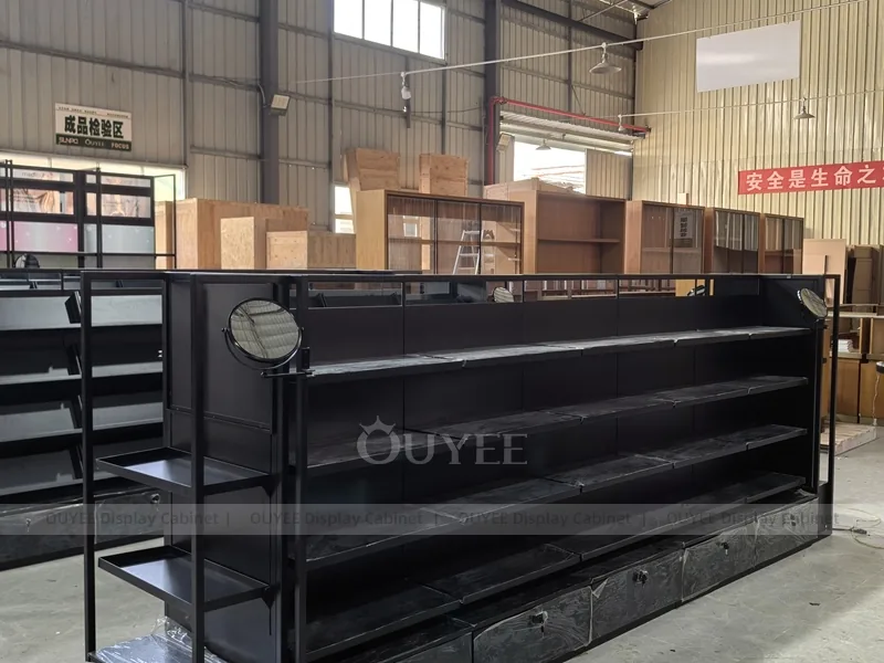 OUYEE can produce this model with black retail panels, durable metal supports, glass display areas, and integrated LED lighting. Dimensions, finish colors, shelf depths, light boxes, tester trays, logo panels, storage modules, and counter details can be adjusted to match the store plan and brand identity. Related inspiration is available across display shelves, wall display, display counter, and our store fixture manufacturing service.
