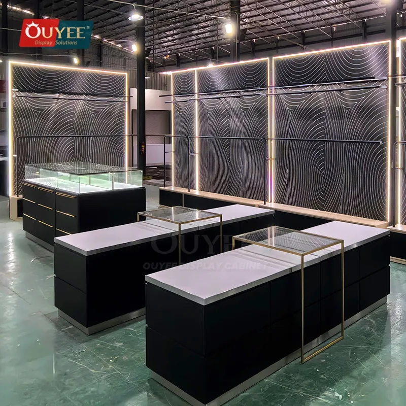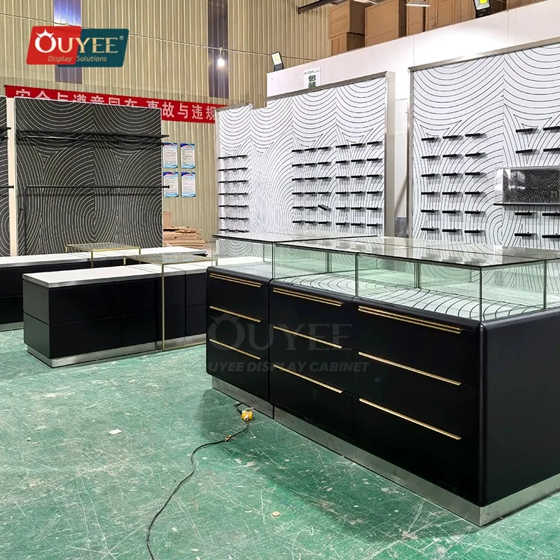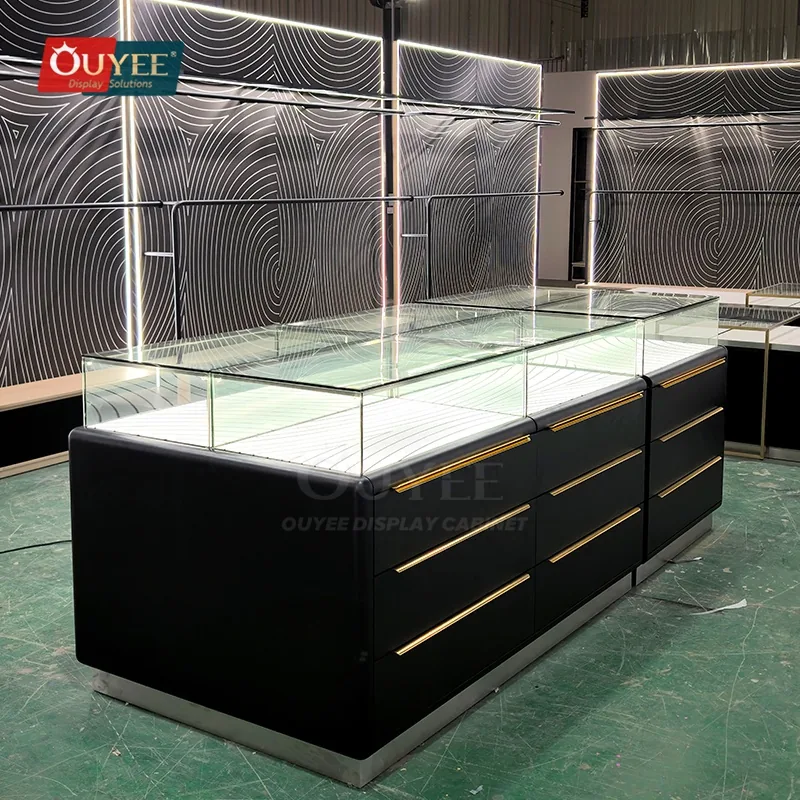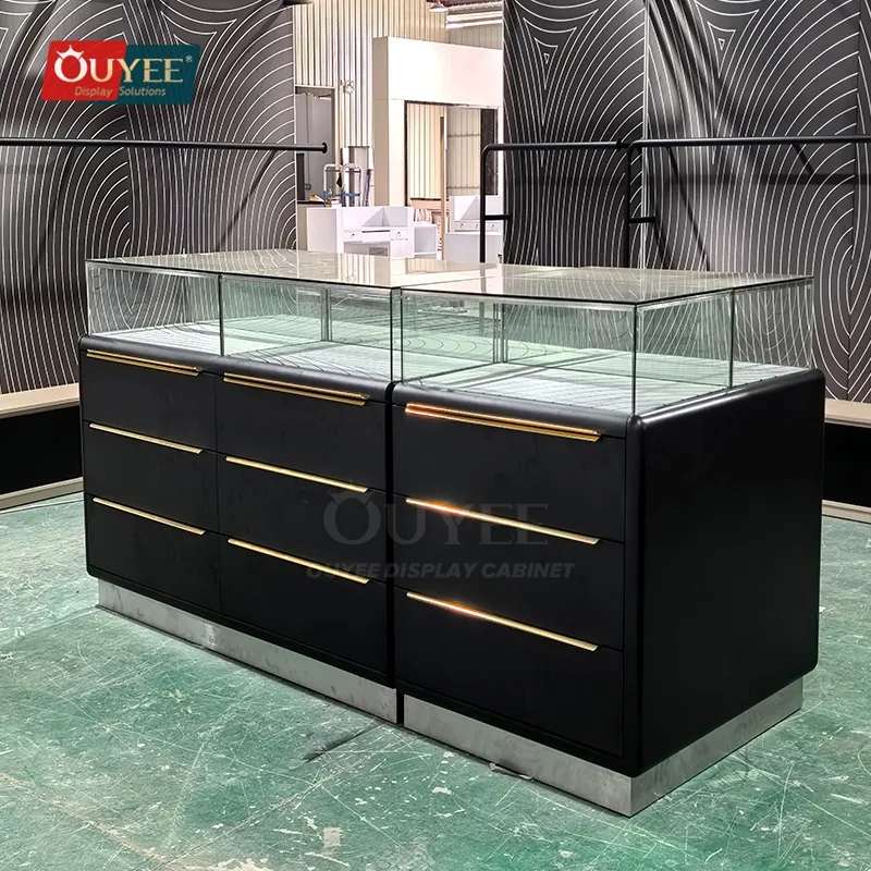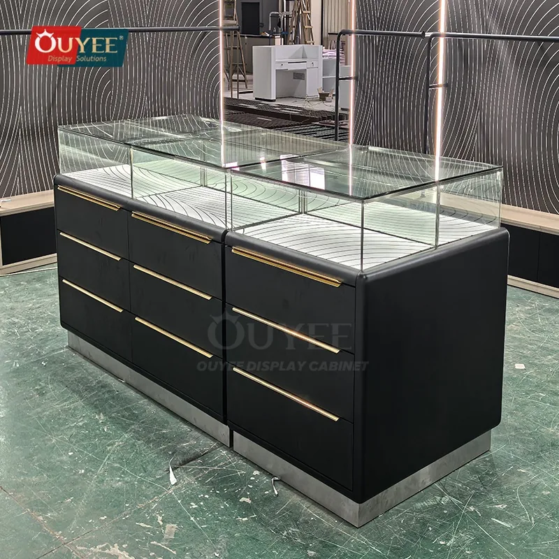 The Black Drawer Base Glass Showcase Table with Brass Handles is designed for jewelry stores, accessory boutiques, lifestyle shops, and premium retail interiors that need a better balance between display security, visual order, and day-to-day selling practicality. For matching showcase references, you can explore our display cabinet page, browse display cases, and review OUYEE support on the manufacturing and materials pages.