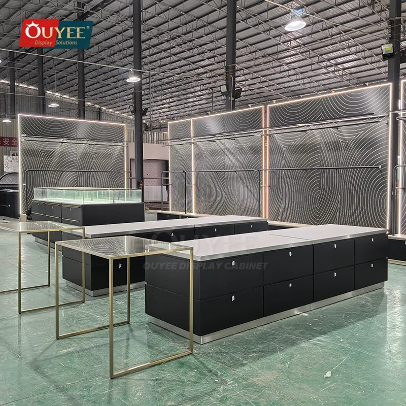 OUYEE can produce this model with tempered glass, metal framing, and integrated storage cabinetry. Depending on project needs, we can adjust dimensions, storage modules, lighting details, finish tones, and branding areas so the fixture fits the store concept and floor plan. For related inspiration, you can also browse glass display cabinet, display cases and our store fixture manufacturing capabilities.