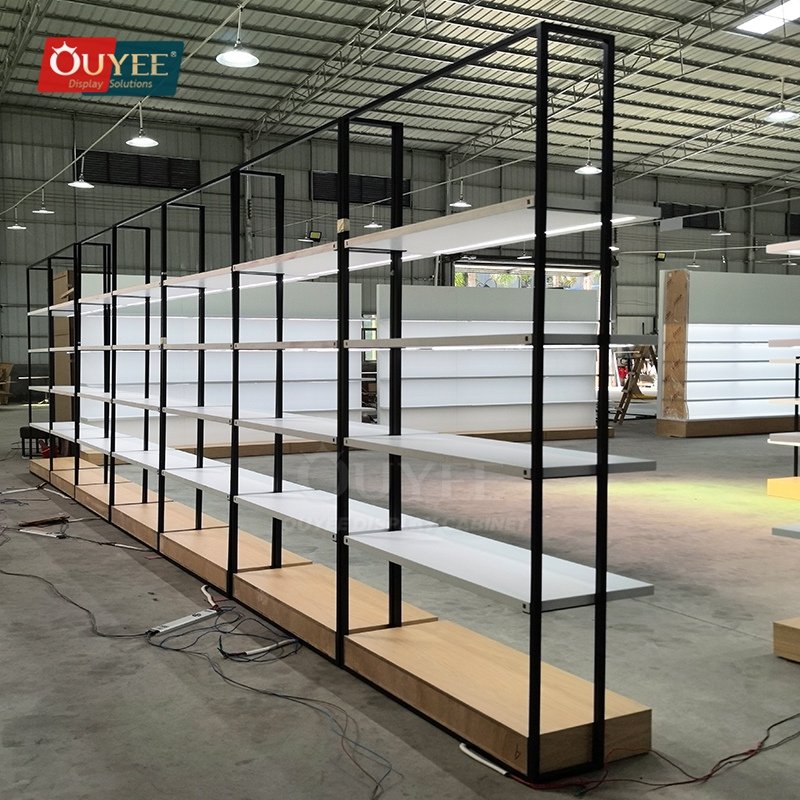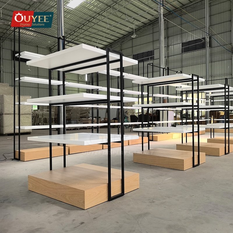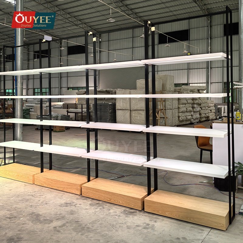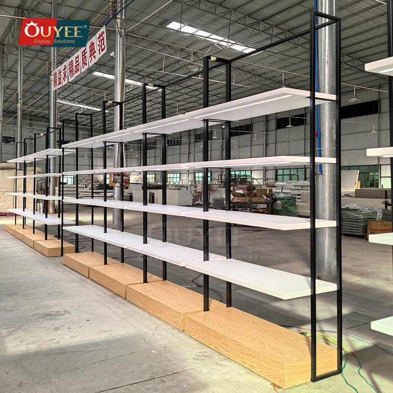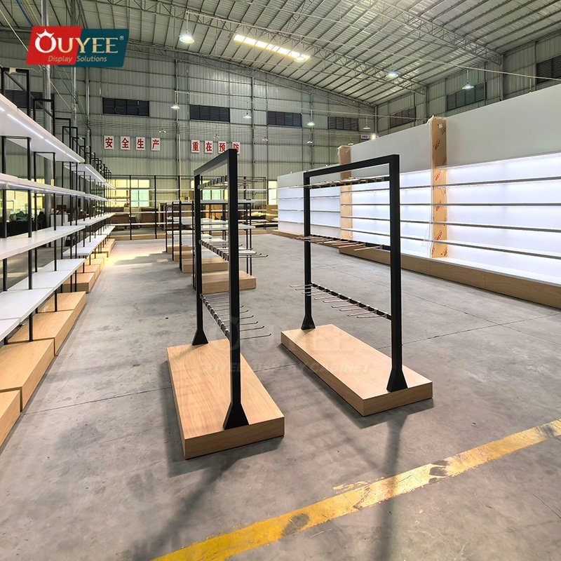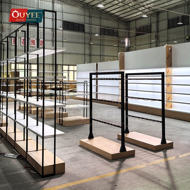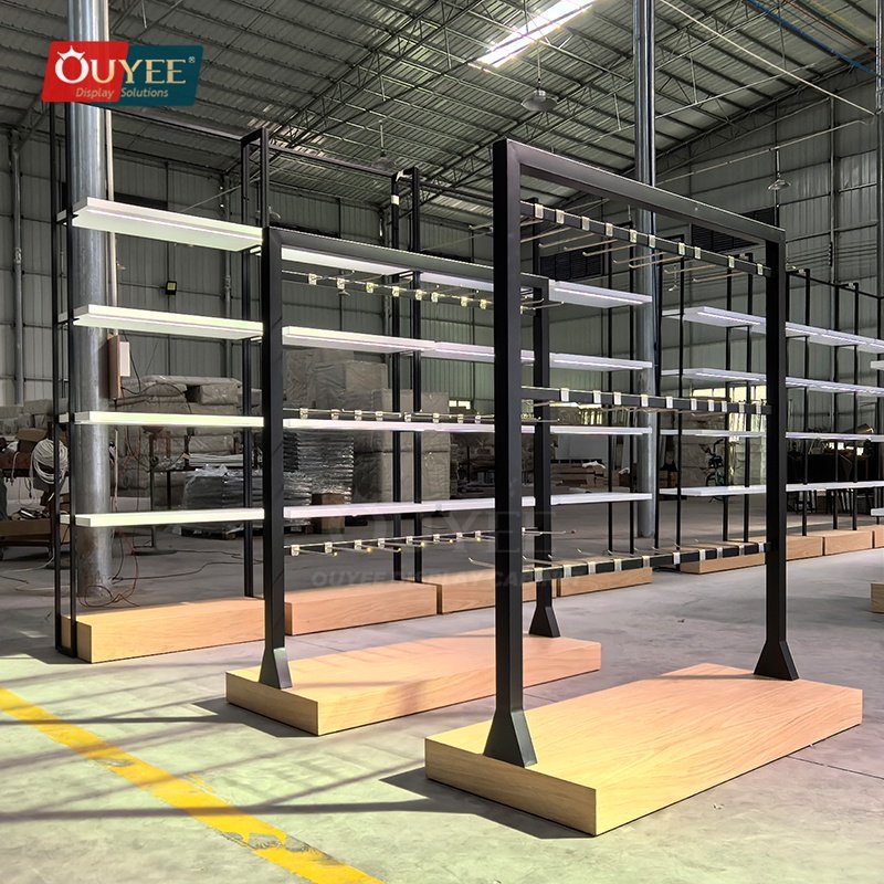OUYEE can produce this model with wood finish panels and metal framing. Depending on project needs, we can adjust dimensions, shelf spacing, accessory modules, finish tones, graphic areas, and lighting details so the fixture fits the brand language and the available floor plan. For related inspiration, you can also browse display shelves and our store fixture manufacturing capabilities.