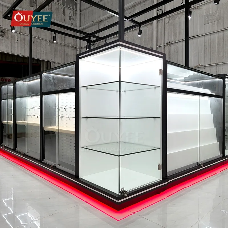 OUYEE can produce this model with tempered glass, metal framing, and integrated LED lighting. Depending on project needs, we can adjust dimensions, storage modules, lighting details, finish tones, and branding areas so the fixture fits the store concept and floor plan. For related inspiration, you can also browse glass display cabinet, display cases and our store fixture manufacturing capabilities.