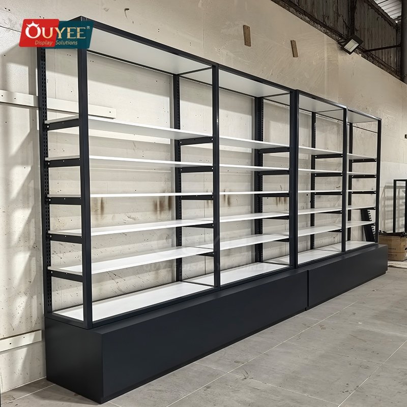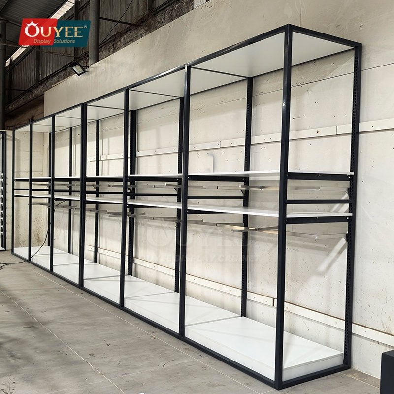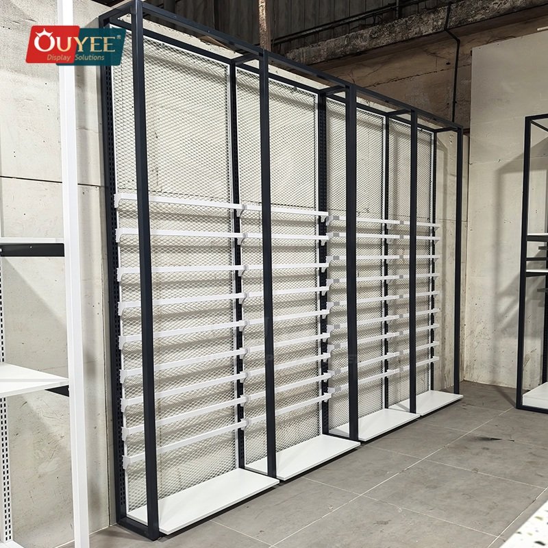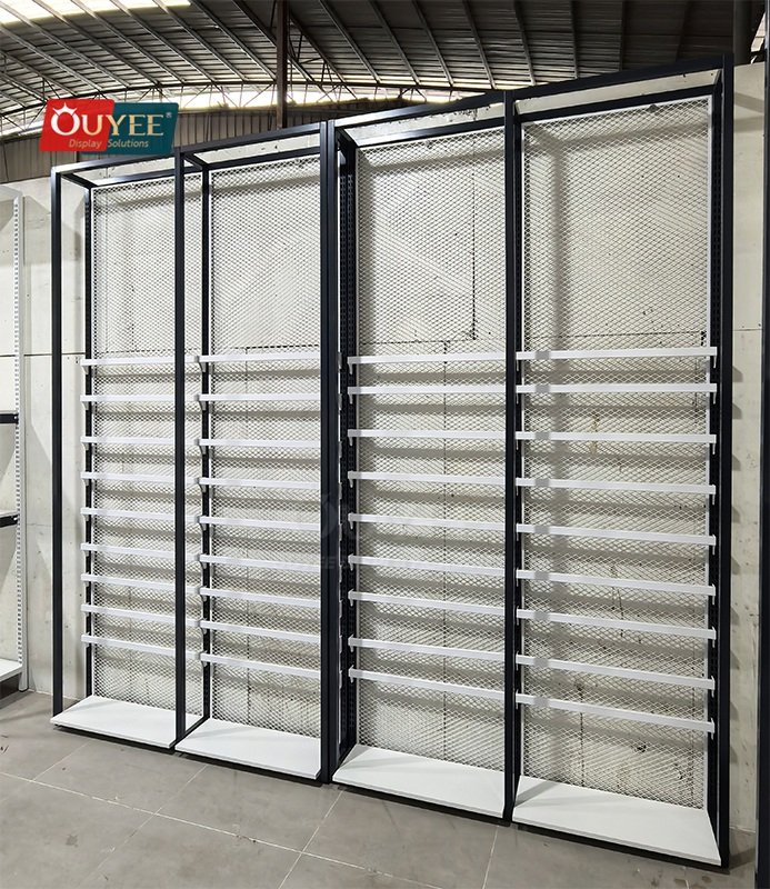 OUYEE can produce this model with metal framing. Depending on project needs, we can adjust dimensions, shelf spacing, accessory modules, finish tones, graphic areas, and lighting details so the fixture fits the brand language and the available floor plan. For related inspiration, you can also browse wall display ideas and our store fixture manufacturing capabilities.