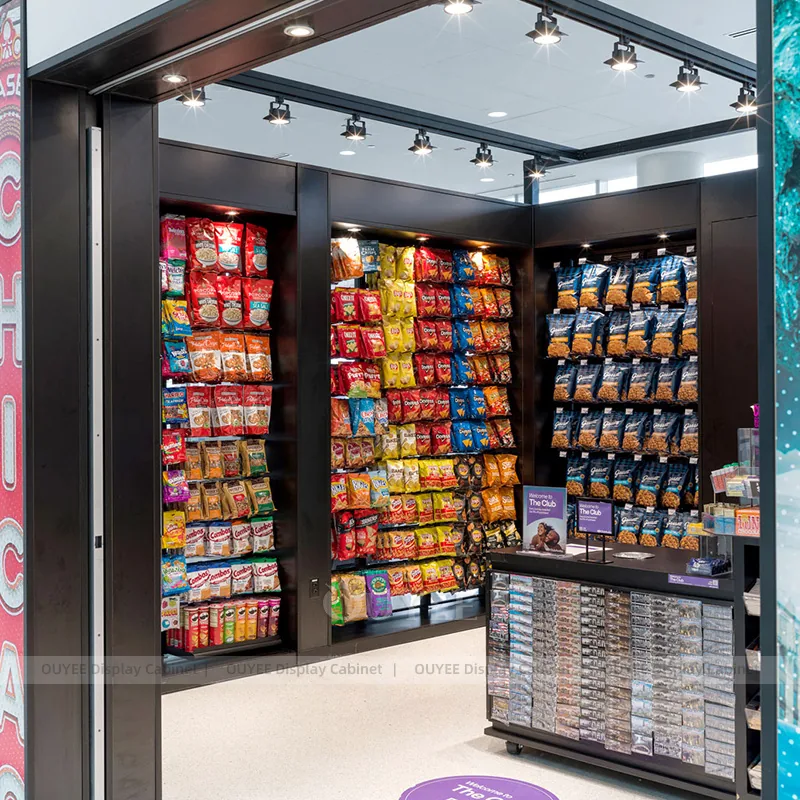 The fixture uses a storefront-style kiosk structure that combines entry visibility with efficient perimeter merchandising. That gives teams more control over category separation, display density, and replenishment rhythm, which is especially helpful for remodels, new-store programs, and high-traffic commercial interiors.
