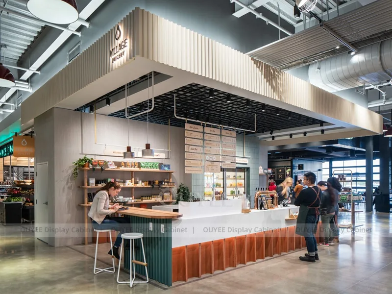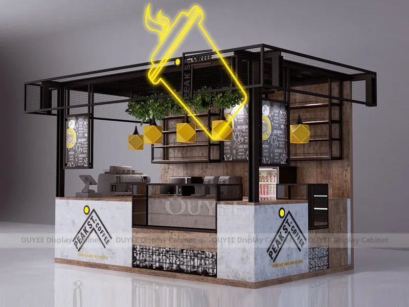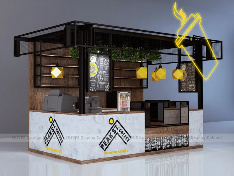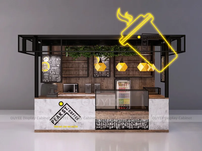 OUYEE can customize this model with powder-coated metal details. Store owners can adjust size, finish, layout, logo panel, counter height, storage structure, menu areas, cup storage, topping display, lighting position, counter depth, and brand logo details to match the final shop drawing.