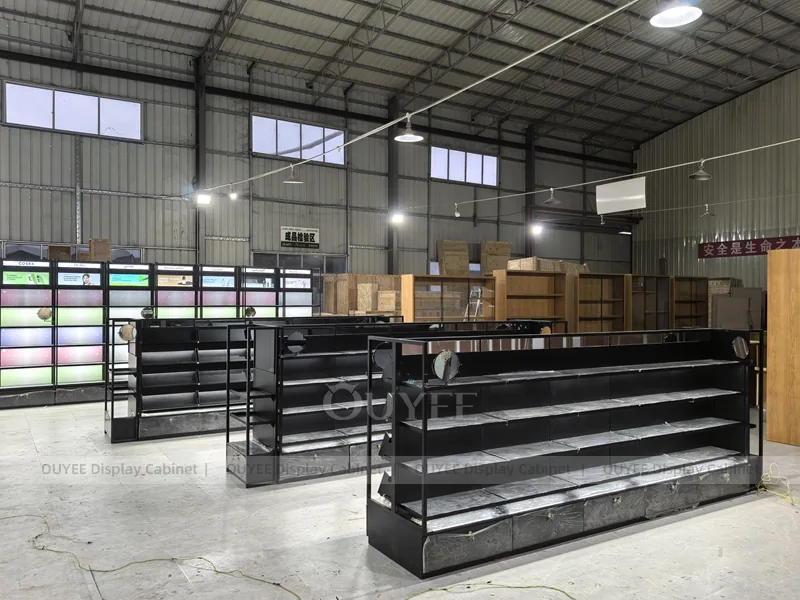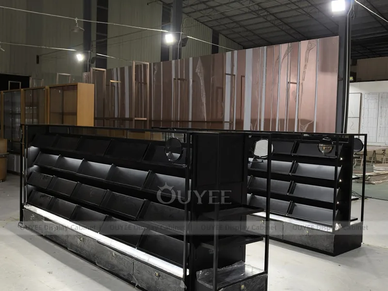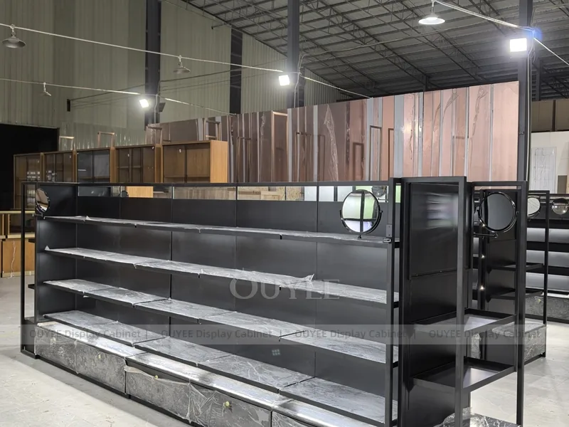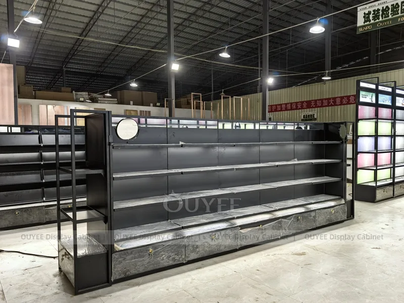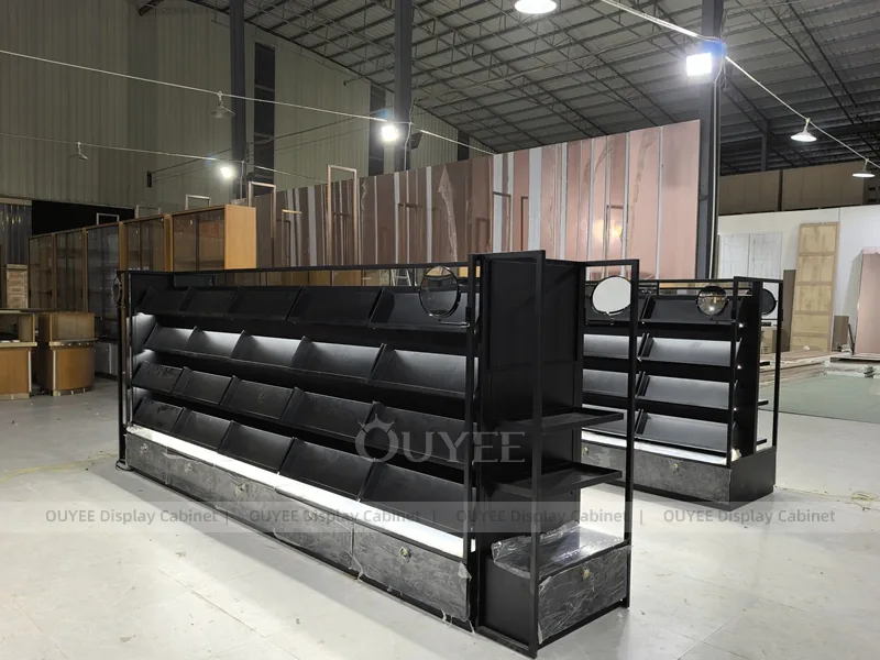 OUYEE can produce this model with black retail panels, durable metal supports, glass display areas, and integrated LED lighting. Dimensions, finish colors, shelf depths, light boxes, tester trays, logo panels, storage modules, and counter details can be adjusted to match the store plan and brand identity. Related inspiration is available across display shelves, wall display, display counter, and our store fixture manufacturing service.