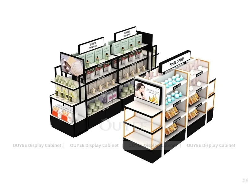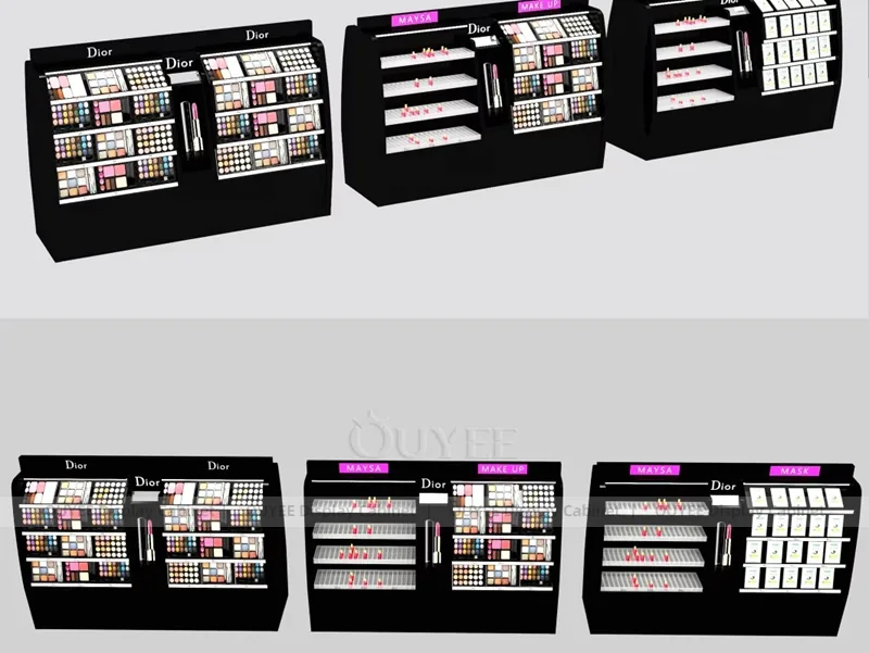 OUYEE can produce this model with black retail panels, durable metal supports, glass display areas, and integrated LED lighting. Dimensions, finish colors, shelf depths, light boxes, tester trays, logo panels, storage modules, and counter details can be adjusted to match the store plan and brand identity. Related inspiration is available across display shelves, wall display, display counter, and our store fixture manufacturing service.