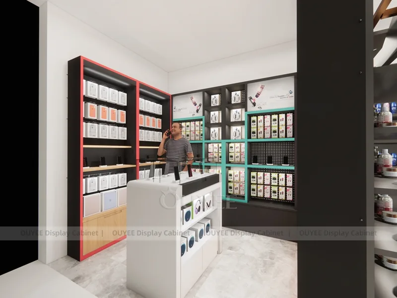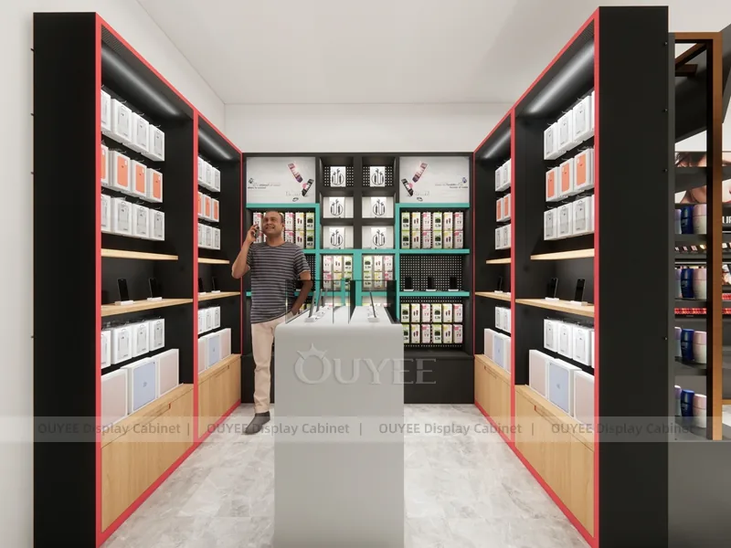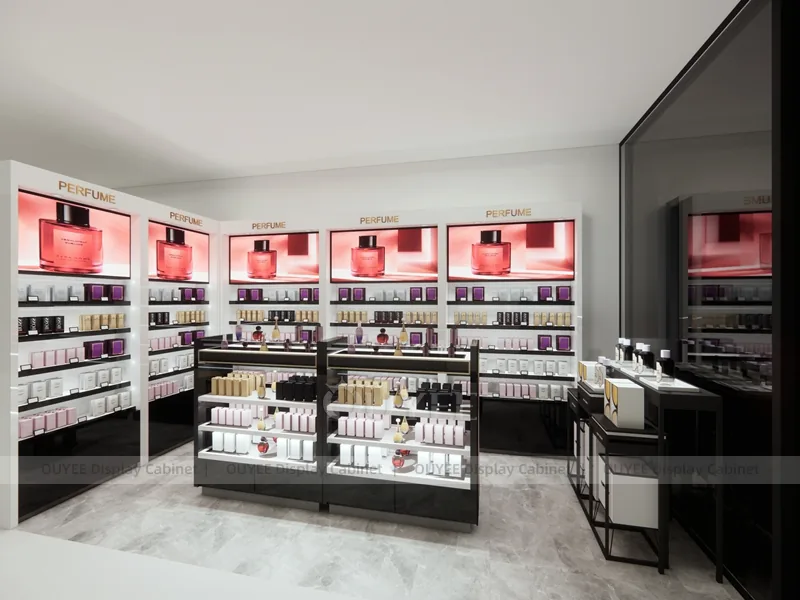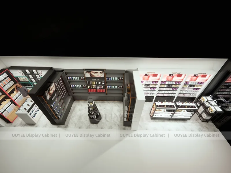 OUYEE can produce this model with black retail panels, durable metal supports, glass display areas, and integrated LED lighting. Dimensions, finish colors, shelf depths, light boxes, tester trays, logo panels, storage modules, and counter details can be adjusted to match the store plan and brand identity. Related inspiration is available across display shelves, wall display, display counter, and our store fixture manufacturing service.