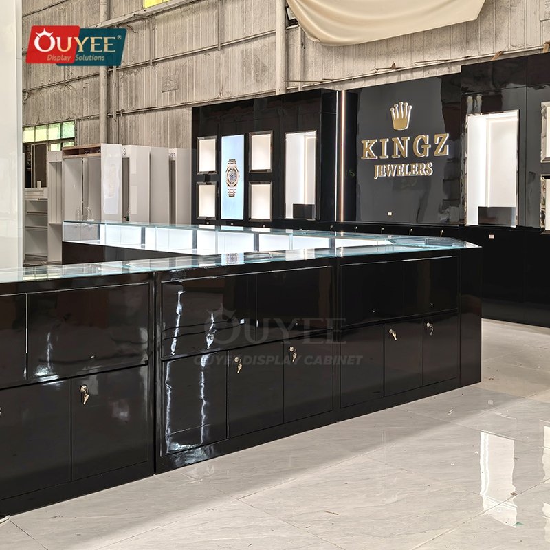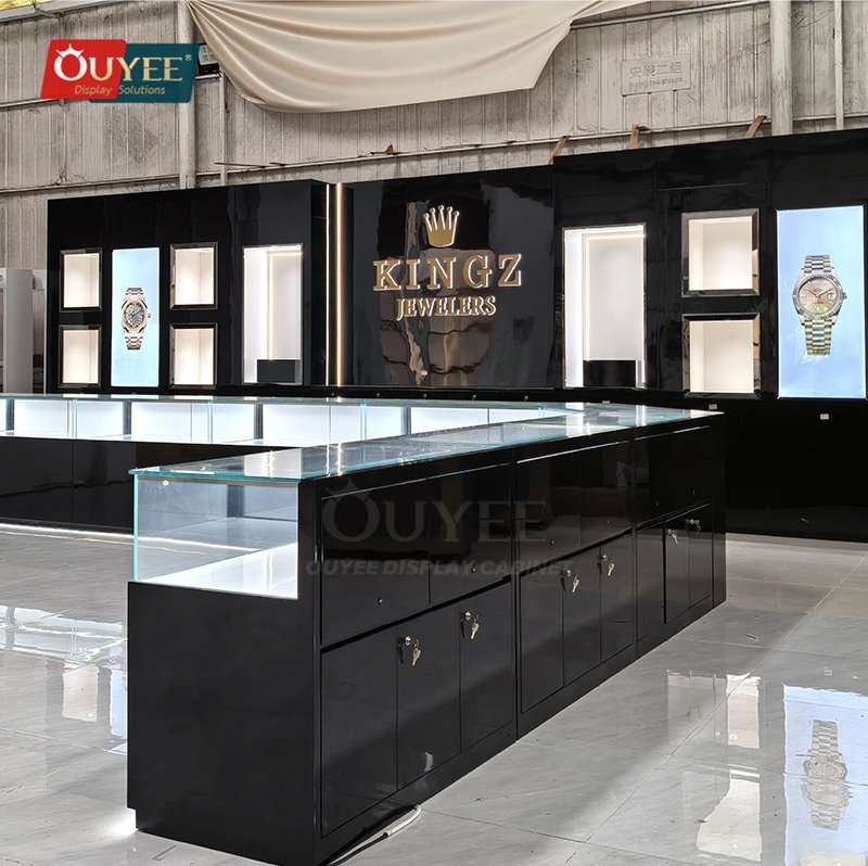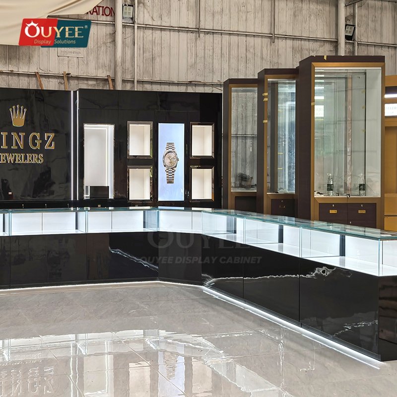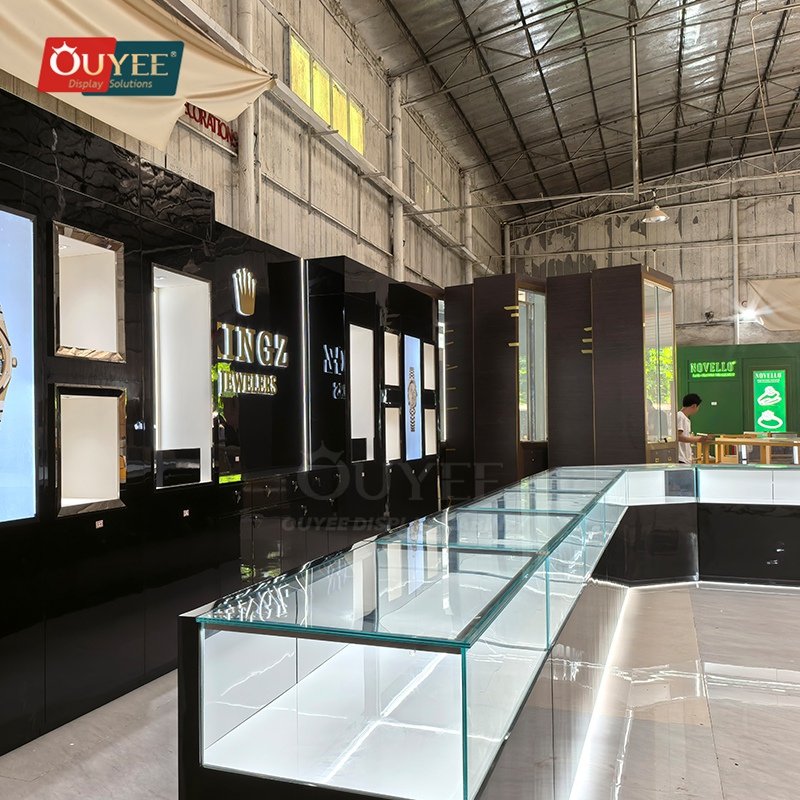 Built with metal framing, this custom display solution is made for long-term commercial use. OUYEE can adjust cabinet dimensions, shelf positions, lighting temperature, finish tones, storage modules, and logo details to match different retail concepts. If your project also needs related showcase ideas, you can browse our glass display cabinet and display cases pages for more references.
