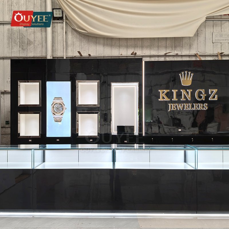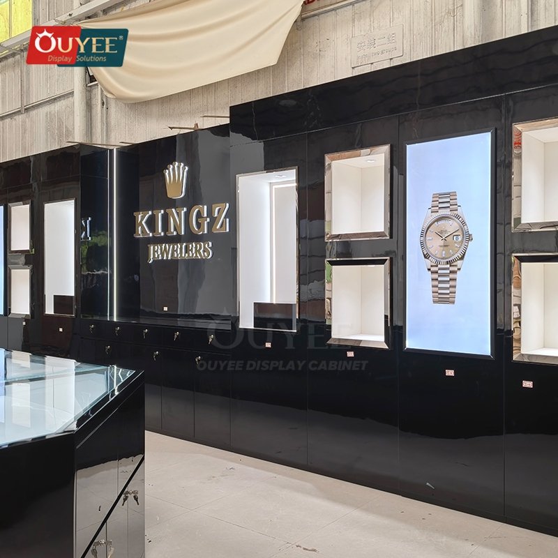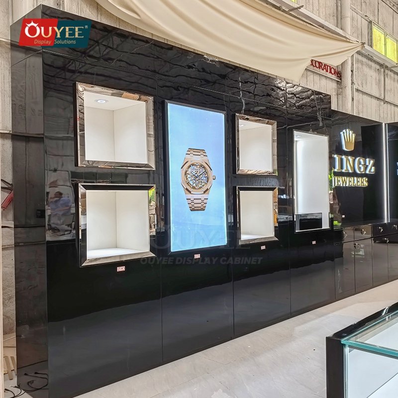 OUYEE presents a Black Wall Display Cabinet with Digital Poster Niches developed for boutiques, jewelry walls, accessory stores, and branded retail interiors. This display cabinet blends showroom presentation, practical storage, and premium lighting details to help brands build a cleaner and more memorable retail environment. As a custom display cabinet solution, it can be adapted for different merchandising concepts, store footprints, and brand identities. You can also explore related inspiration on our display cabinet page, discover material options via materials, and learn how OUYEE handles custom production through our manufacturing service.