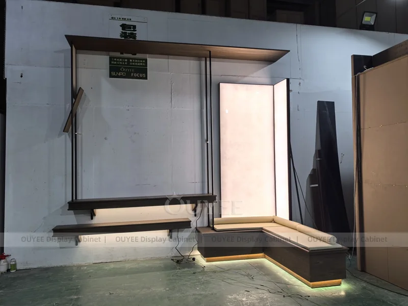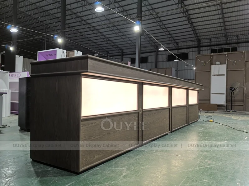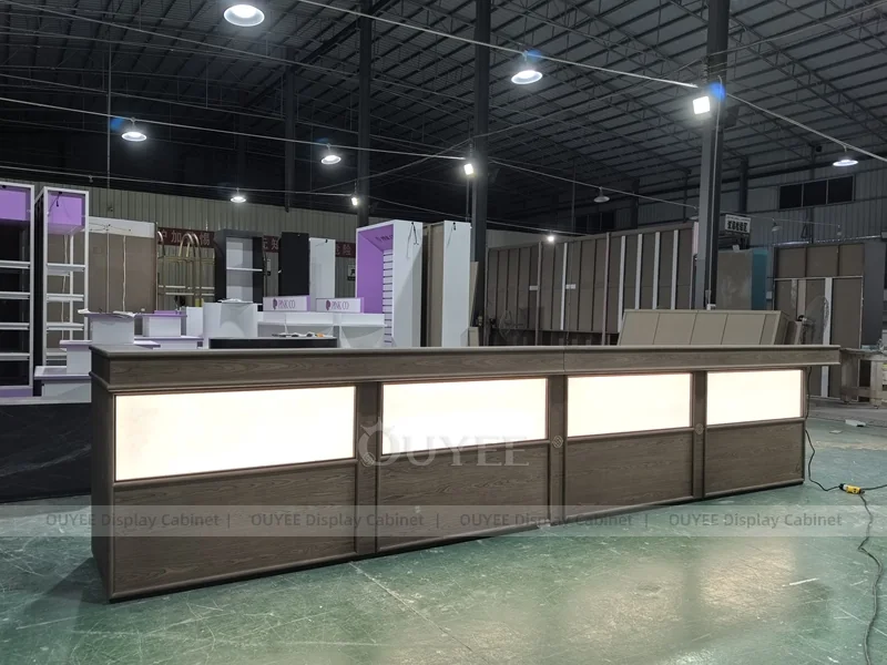 • Factory customization is available for counter size, logo, lighting, storage, worktop, and wall display details.