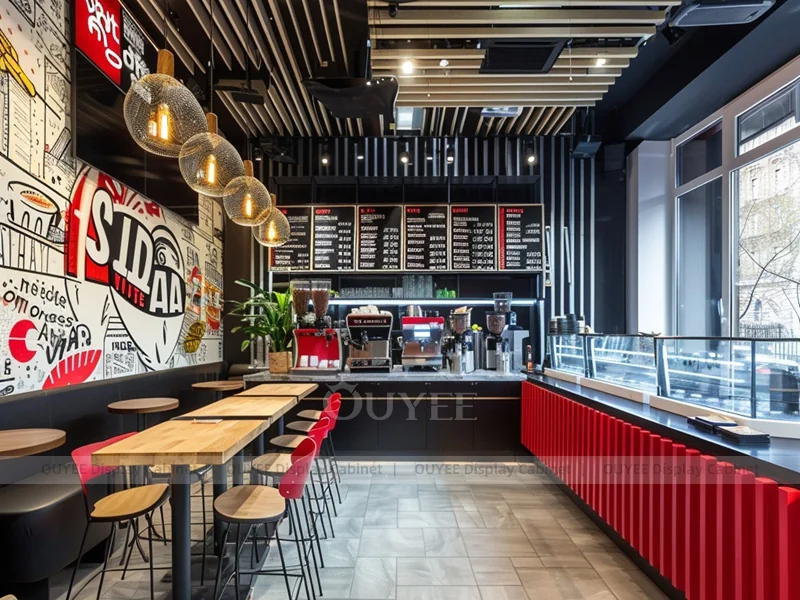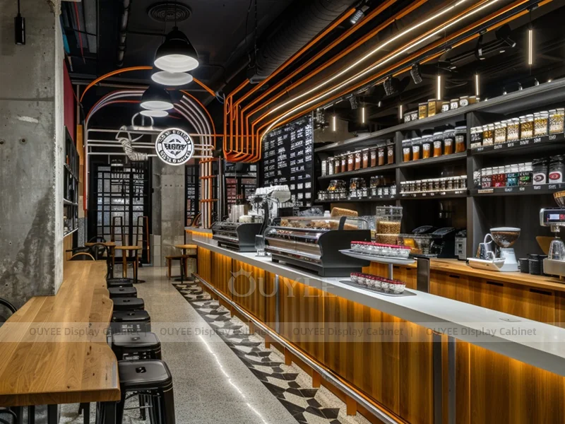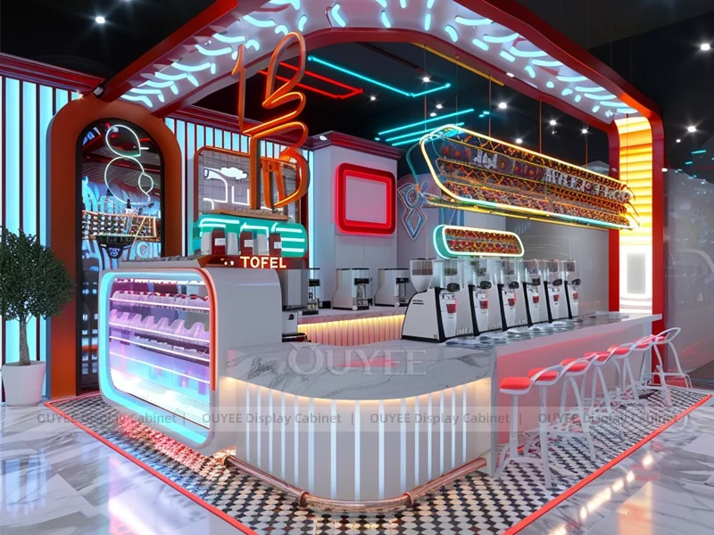OUYEE supports coffee counter design, shop drawings, material selection, manufacturing, packing, and export delivery. We can customize the fixture according to your brand color, logo, store size, electrical planning, and installation requirements.