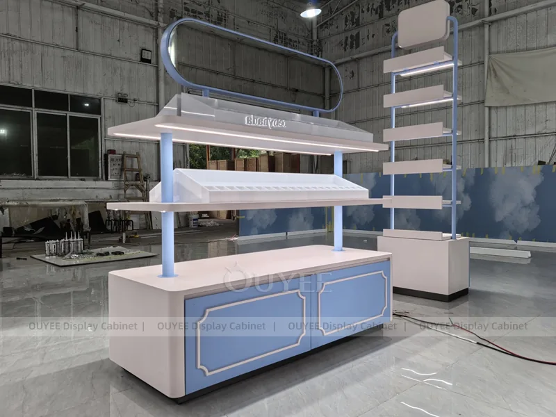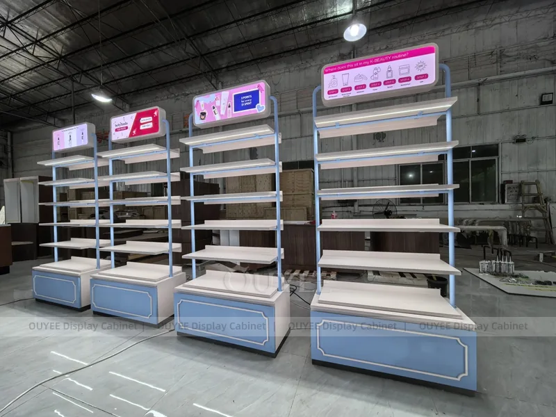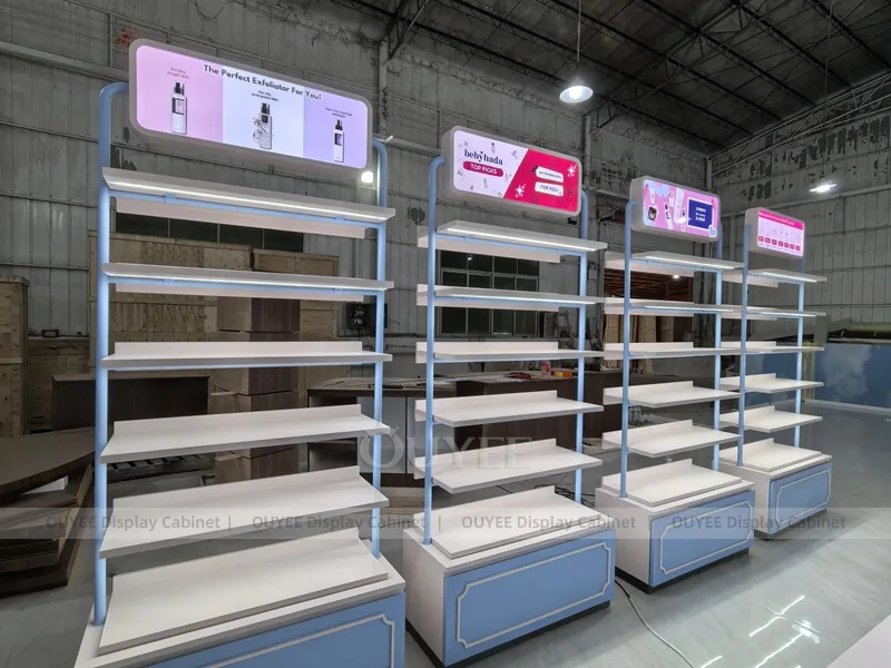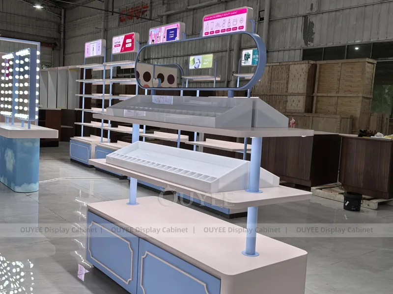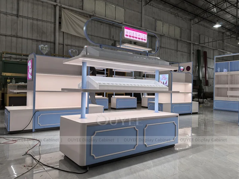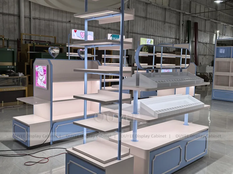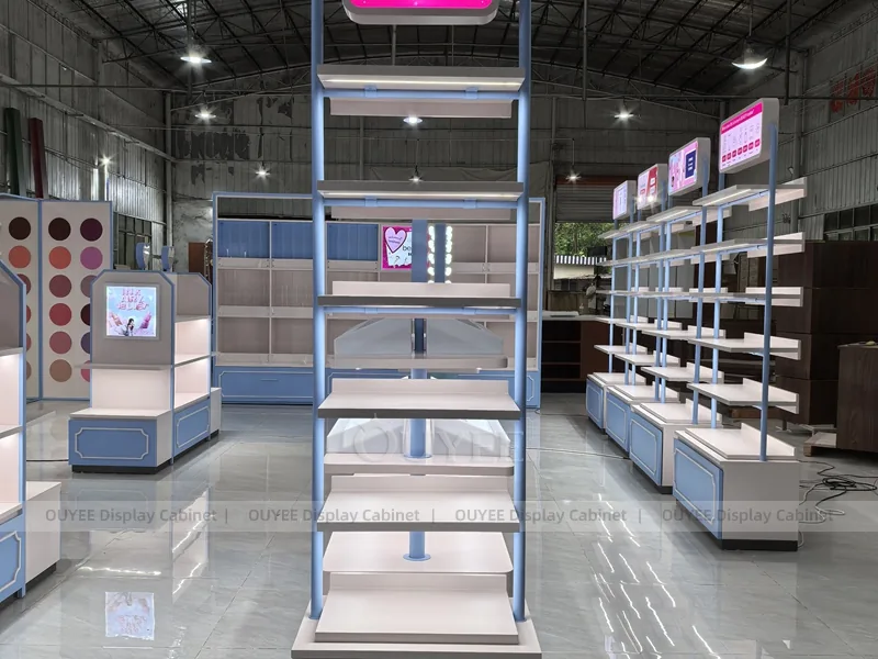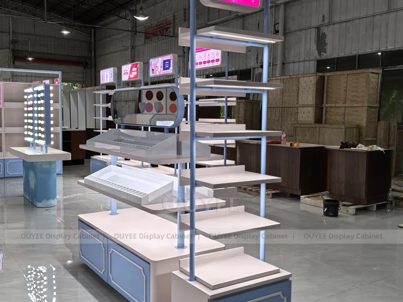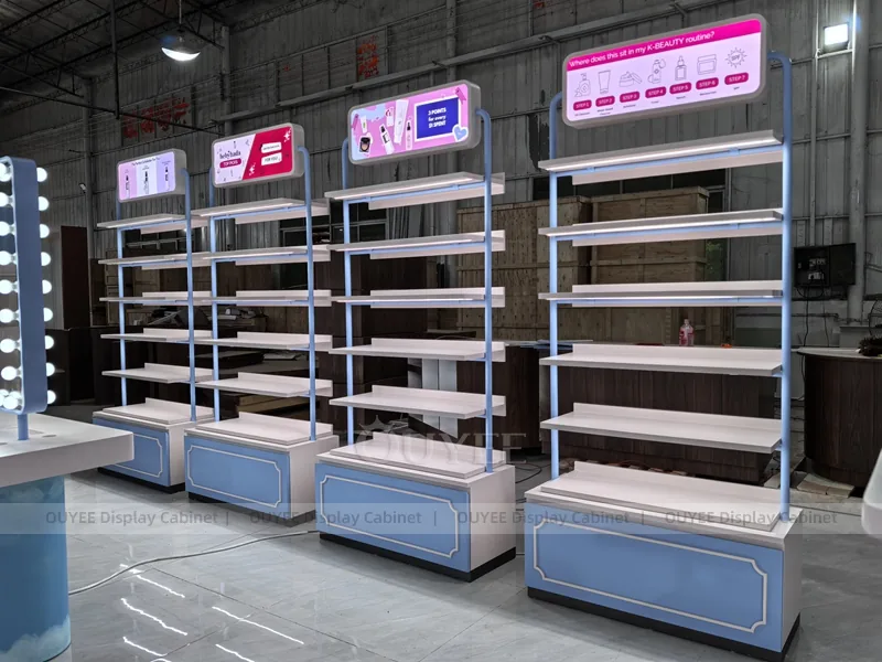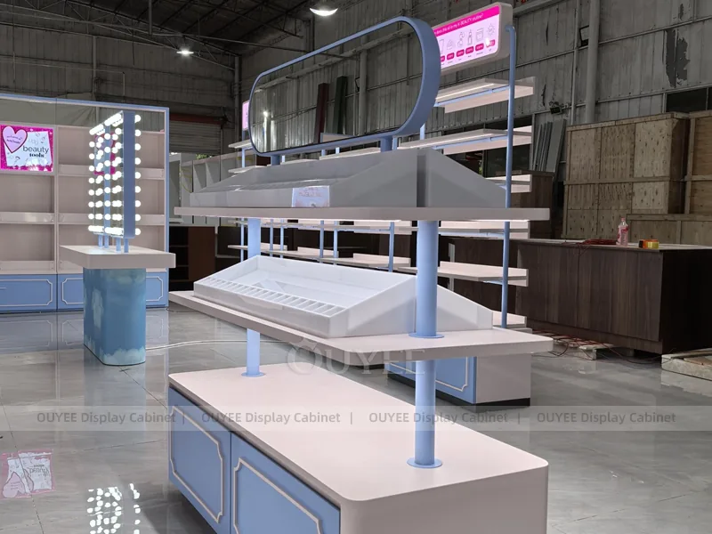 OUYEE can produce this model with custom color retail panels, durable shelving, metal supports, acrylic accents, and integrated LED lighting. Dimensions, finish colors, shelf depths, light boxes, tester trays, logo panels, storage modules, and counter details can be adjusted to match the store plan and brand identity. Related inspiration is available across display shelves, wall display, display counter, and our store fixture manufacturing service.