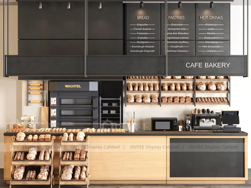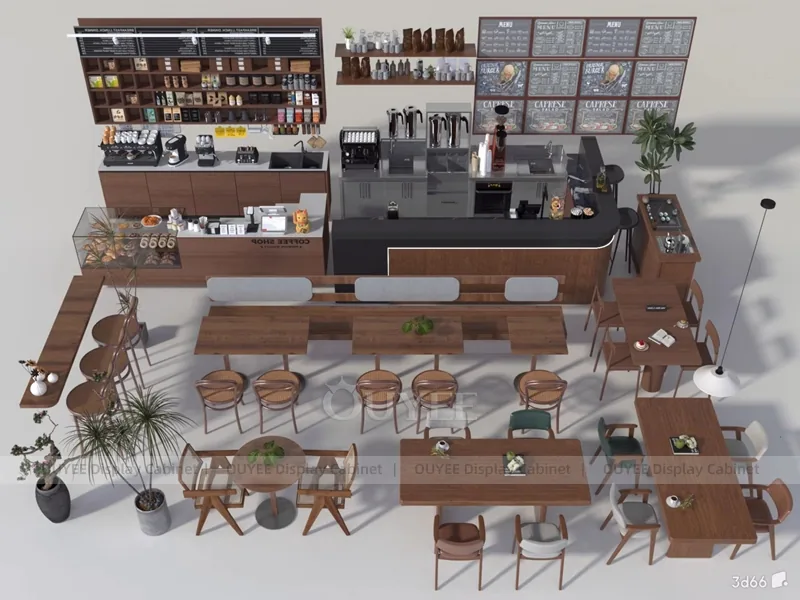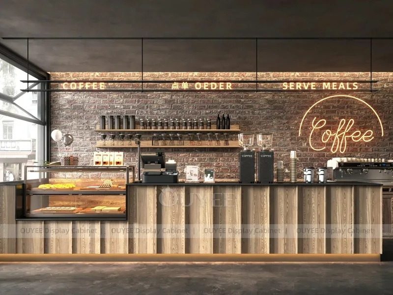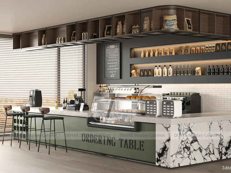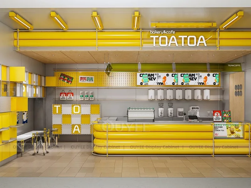 OUYEE can customize this model with custom color retail finishes and durable counter and storage modules. Store owners can adjust size, finish, layout, logo panel, counter height, storage structure, service opening, pickup area, cup storage, equipment clearance, menu areas, cup storage, topping display, lighting position, counter depth, and brand logo details to match the final shop drawing.
