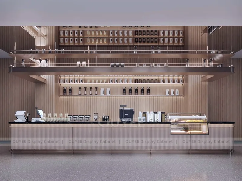 This design uses service-counter layout that connects ordering, drink pickup, storage, and product display zones. It gives the store clear ordering, pickup, display, storage, and replenishment zones so staff can work smoothly during busy drink-service hours.