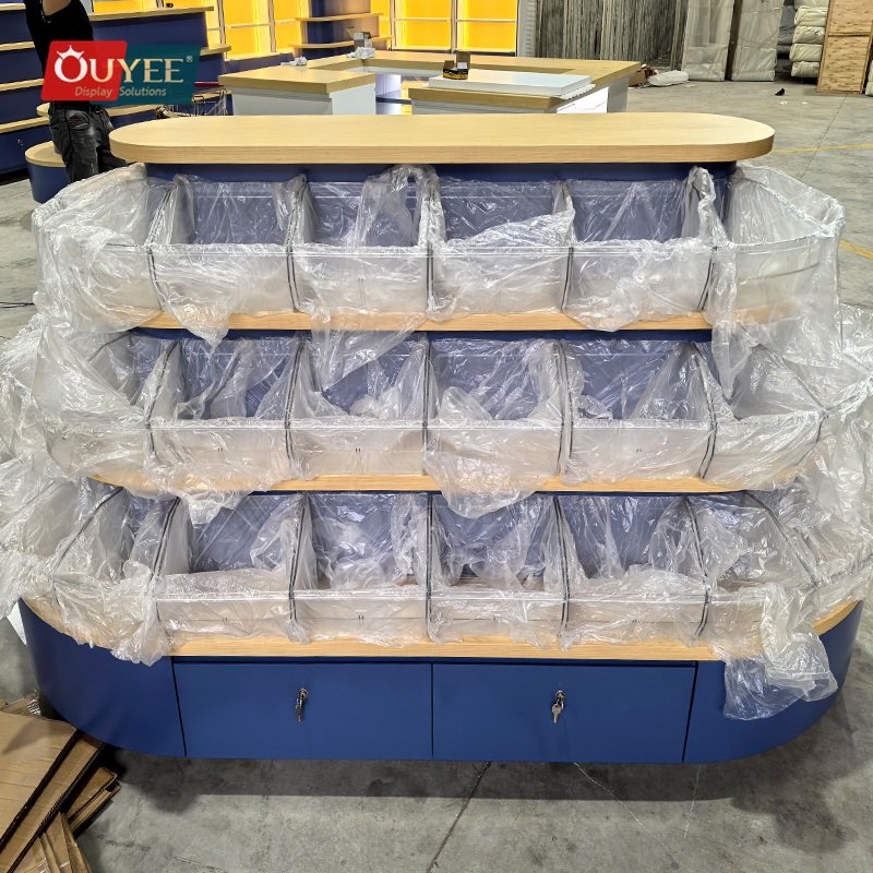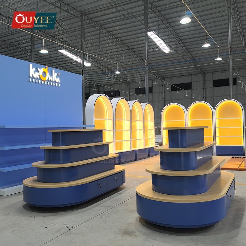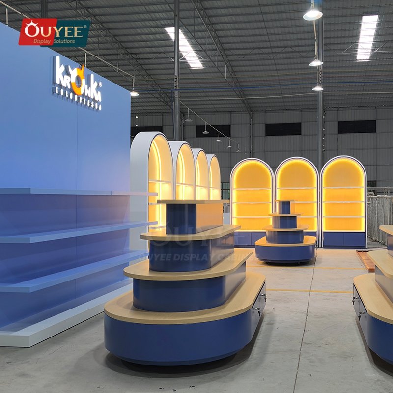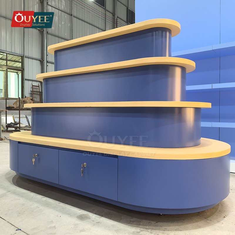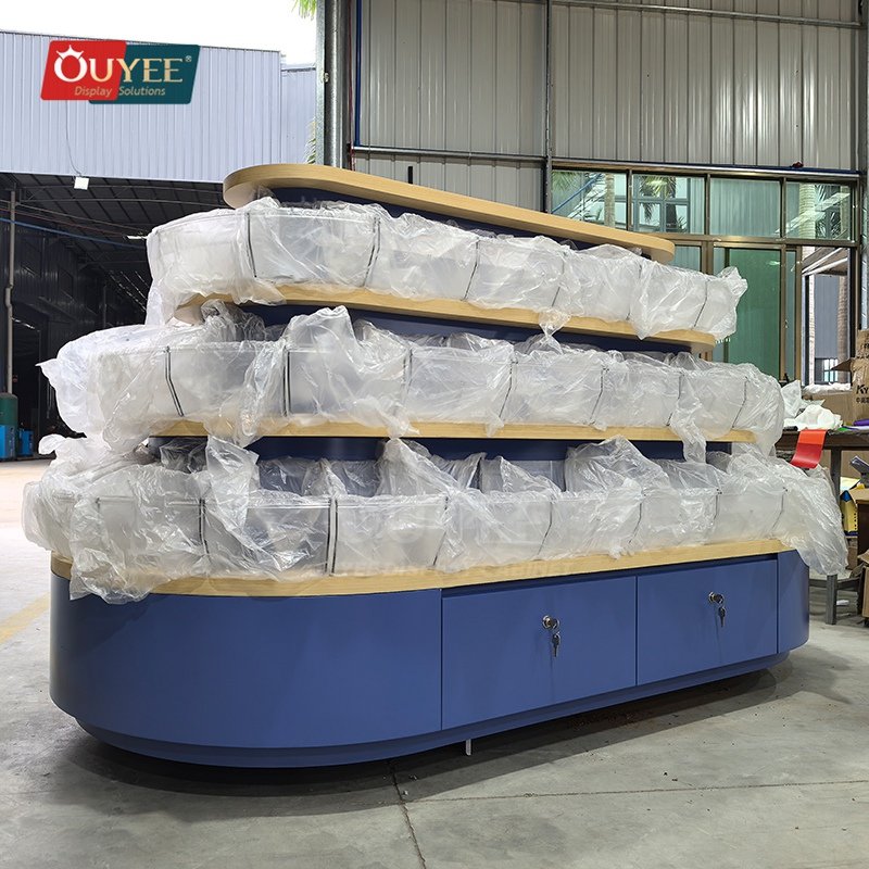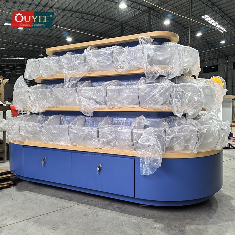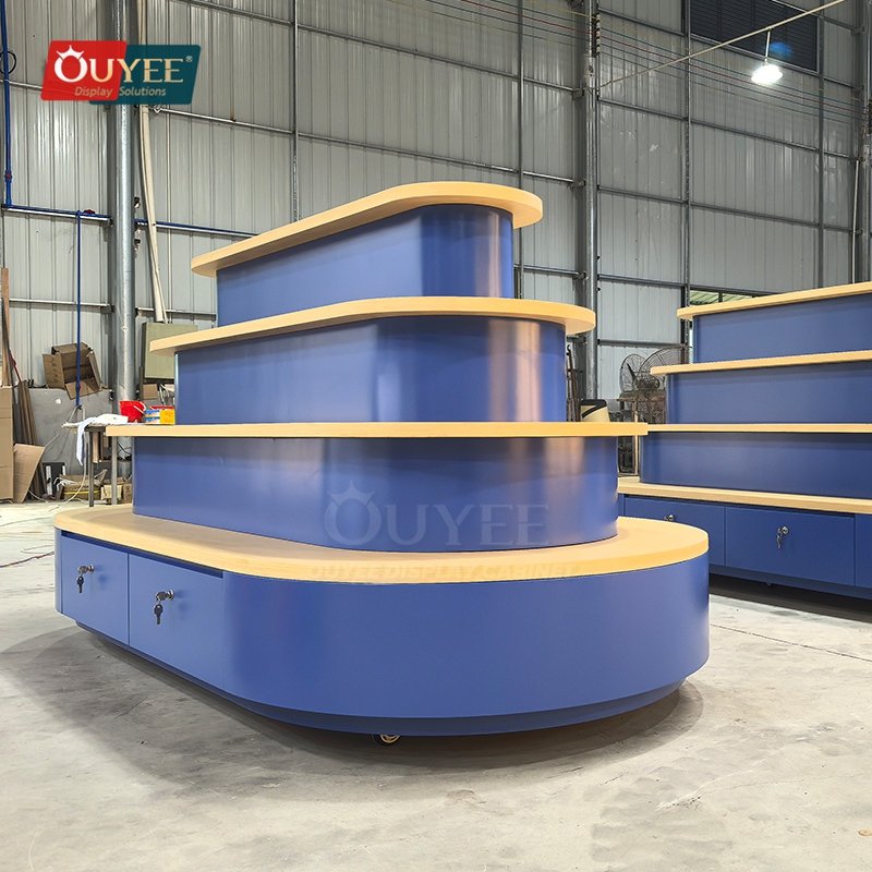 OUYEE develops Blue Tiered Island Display Stand with Curved Shelves for shopping mall stores, open-plan boutiques, promotional zones, and center-floor retail displays. This display stand supports cleaner merchandising, stronger product focus, and flexible custom production for stores that need a more deliberate fixture language. For similar fixture references, you can visit our display shelves page, browse more store shelving displays, and review OUYEE production support on the manufacturing and materials pages.