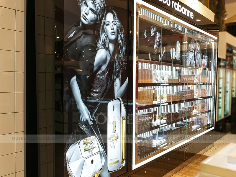 OUYEE can produce this model with commercial display panels, durable metal supports, tempered glass options, acrylic details, and integrated LED lighting. Dimensions, finish colors, shelf depths, light boxes, tester trays, logo panels, storage modules, and counter details can be adjusted to match the store plan and brand identity. Related inspiration is available across display shelves, display cases, wall display, and our store fixture manufacturing service.