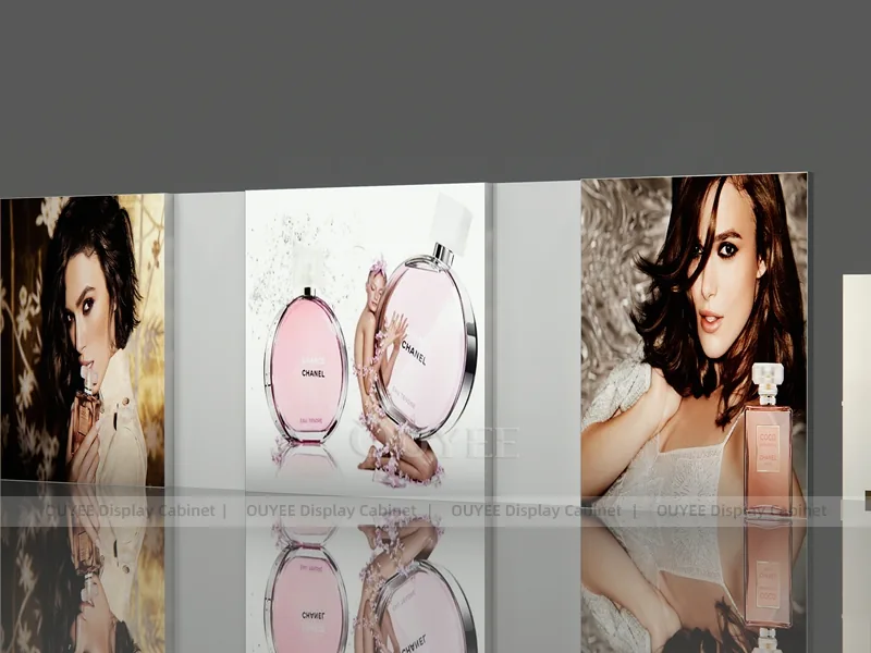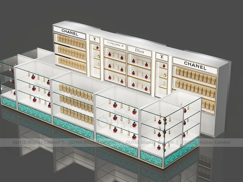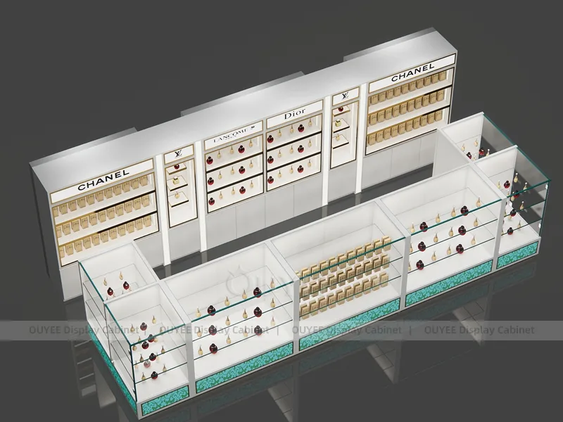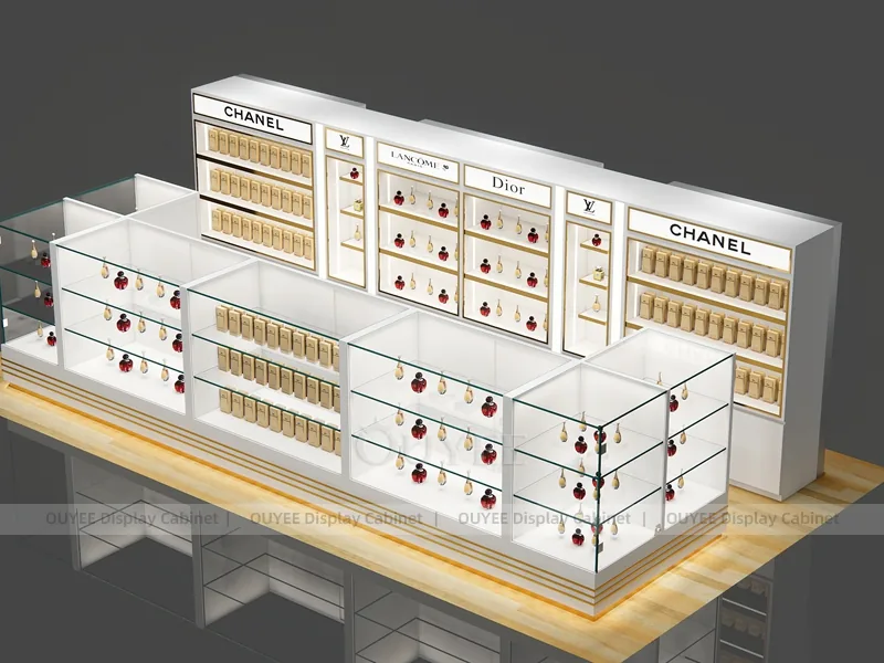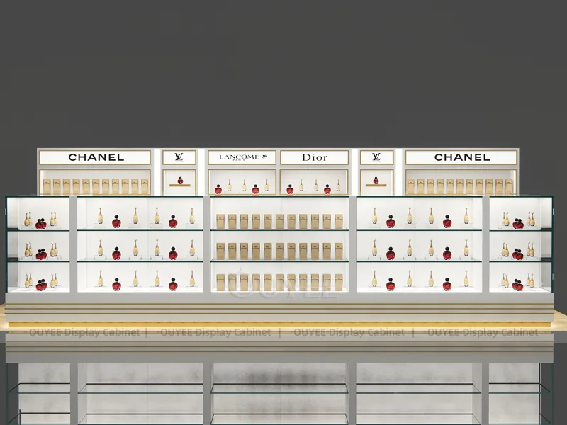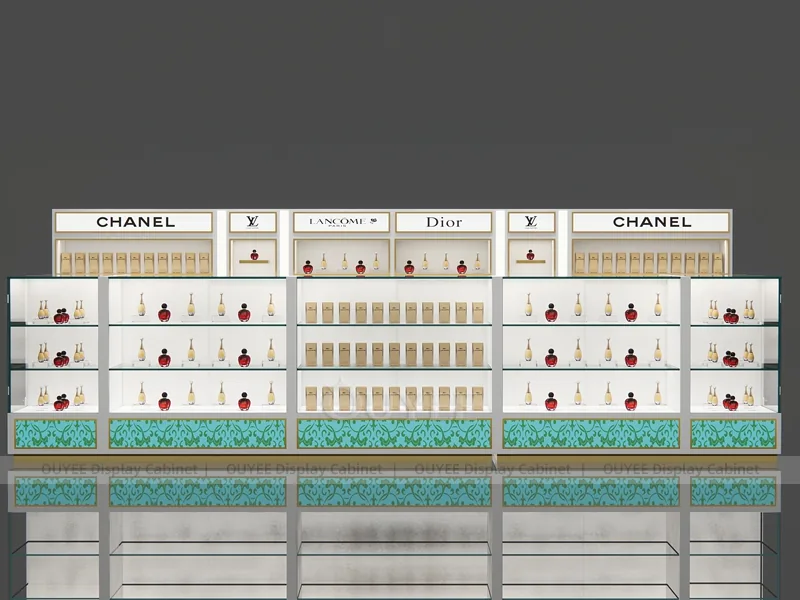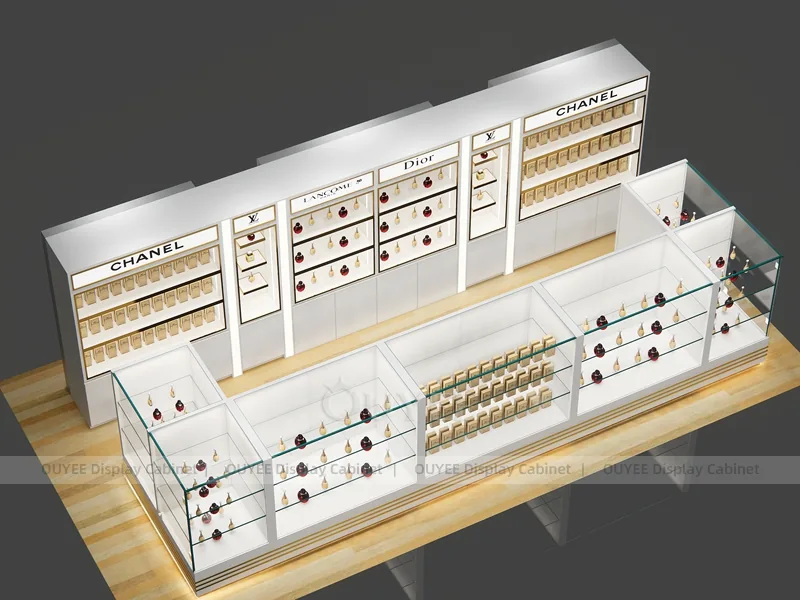 OUYEE can produce this model with commercial display panels, durable metal supports, tempered glass options, acrylic details, and integrated LED lighting. Dimensions, finish colors, shelf depths, light boxes, tester trays, logo panels, storage modules, and counter details can be adjusted to match the store plan and brand identity. Related inspiration is available across display shelves, wall display, display counter, and our store fixture manufacturing service.