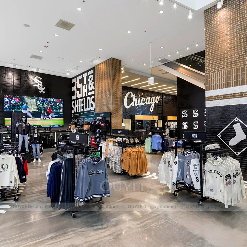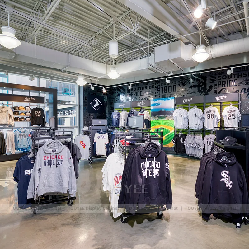 Built for stadium team stores, university fan shops, sports merchandise retailers, and branded event retail, the Chicago Team Apparel Rolling Rack Store Display gives retailers a practical way to present apparel collections, folded garments, hanging presentation, and coordinated retail stories with cleaner zoning, better visibility, and more flexible fixture planning.
