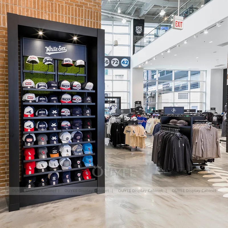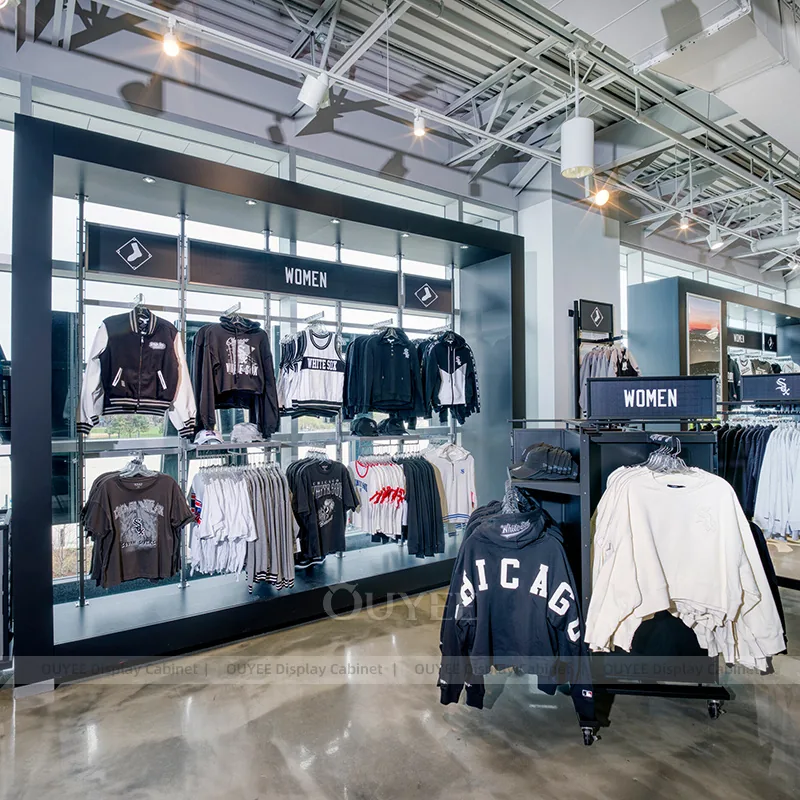 OUYEE can produce this model with powder-coated metal framing. Depending on the project, we can adjust dimensions, storage capacity, shelf depths, hanging components, branding graphics, and finish details so the system fits the real floor plan and product mix. Related inspiration is available across clothing racks, retail store display and our store fixture manufacturing service.