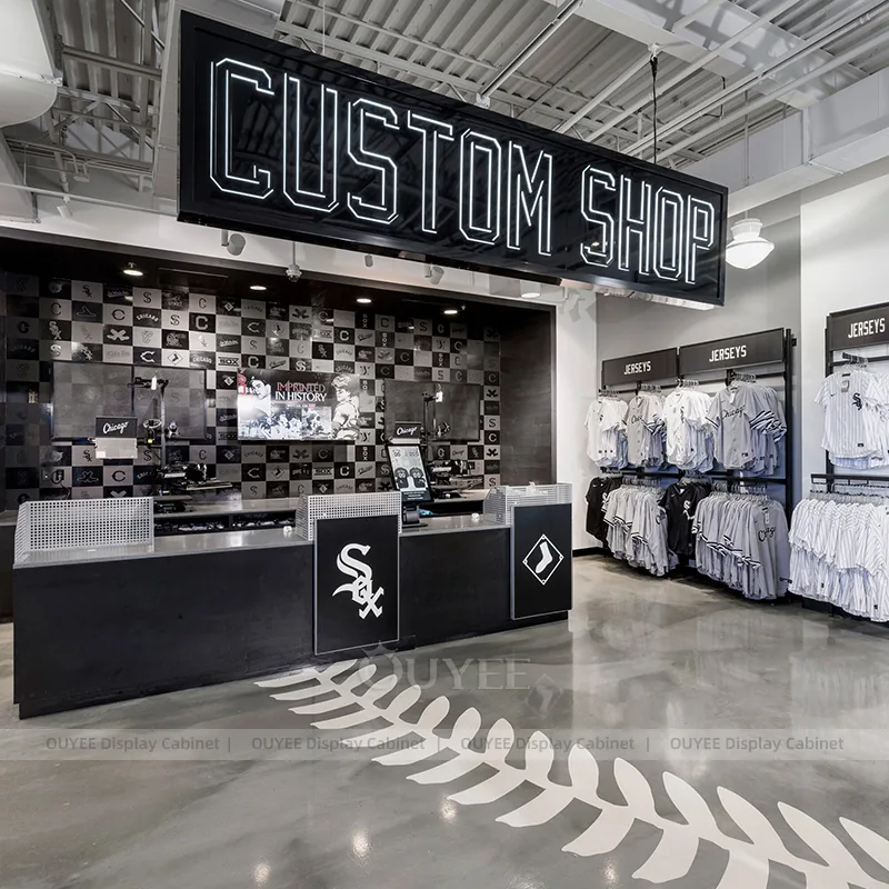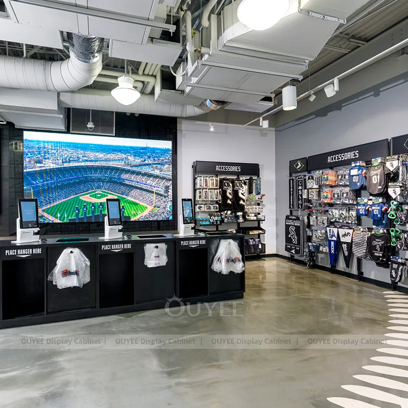 This configuration works well for stadium team stores, university fan shops, sports merchandise retailers, and branded event retail. It is suitable for stores that want custom display hardware, more coherent fixture language, and a practical combination of feature presentation, everyday stock holding, and shopper-friendly access.