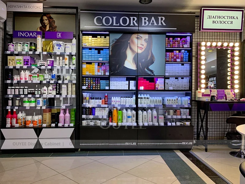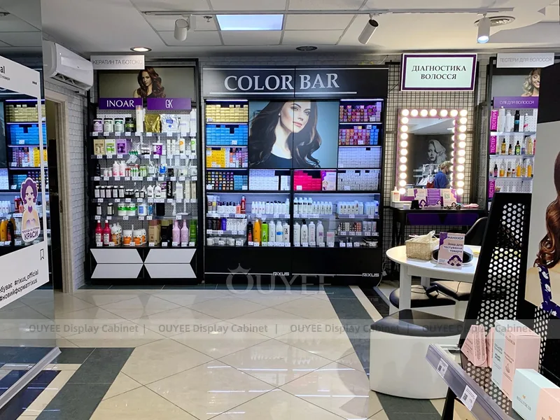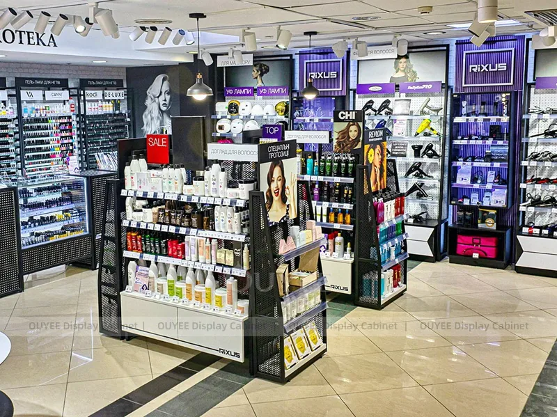 OUYEE can produce this model with commercial display panels, durable metal supports, tempered glass options, acrylic details, and integrated LED lighting. Dimensions, finish colors, shelf depths, light boxes, tester trays, logo panels, storage modules, and counter details can be adjusted to match the store plan and brand identity. Related inspiration is available across display shelves, wall display, display counter, and our store fixture manufacturing service.