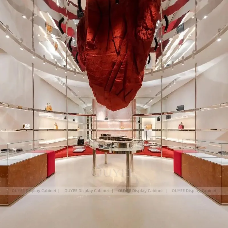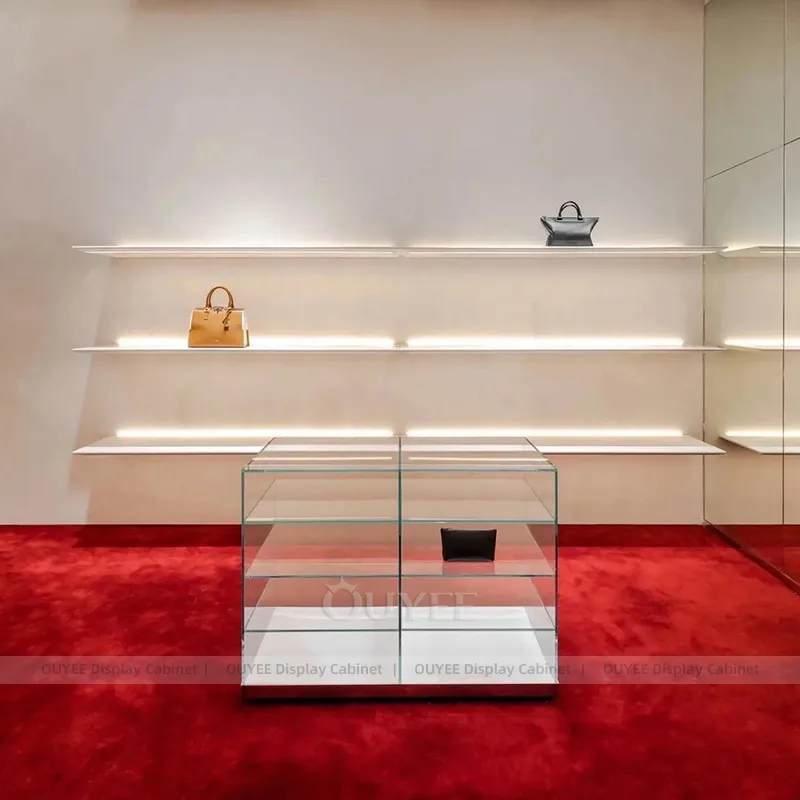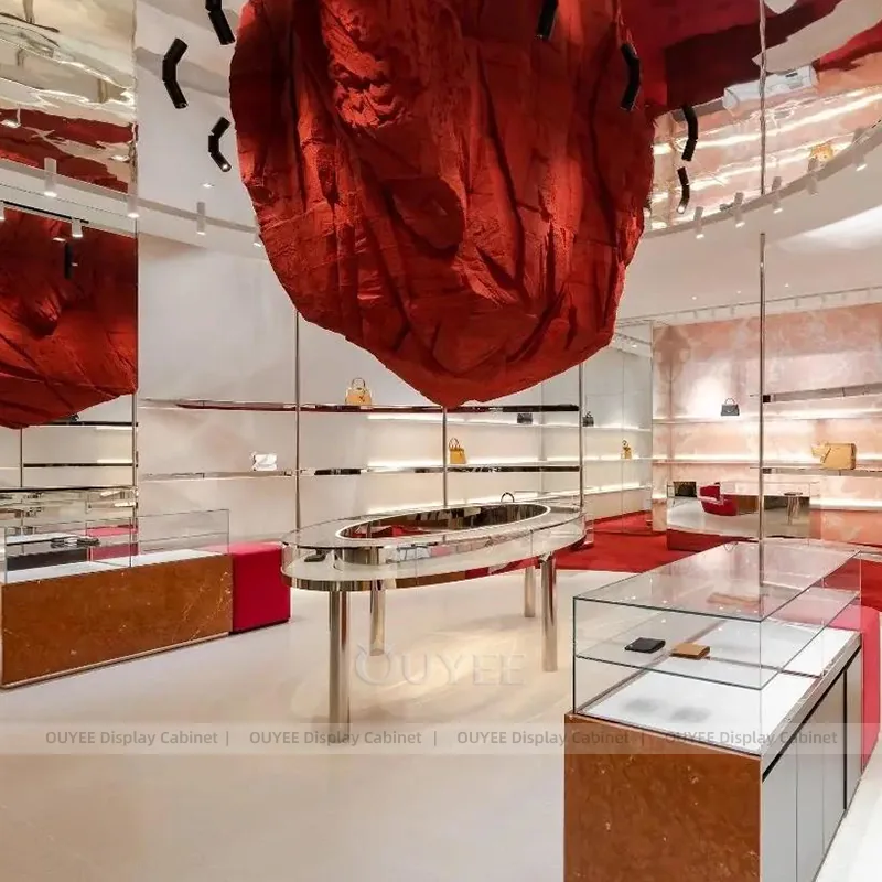 OUYEE can produce this model with tempered glass, lacquered display panels, and custom jewelry fixture joinery. We can adjust dimensions, counter heights, storage details, showcase proportions, branding areas, and warm beige finishes so the project fits the store concept, SKU mix, and floor plan. Related inspiration is available across jewelry shop displays, display cases and our store fixture manufacturing service.