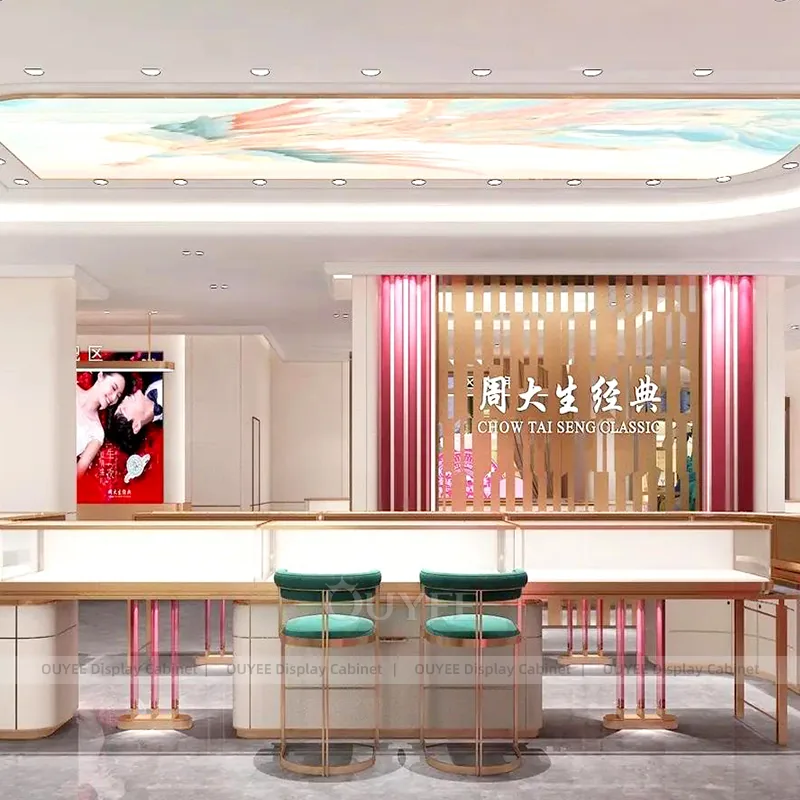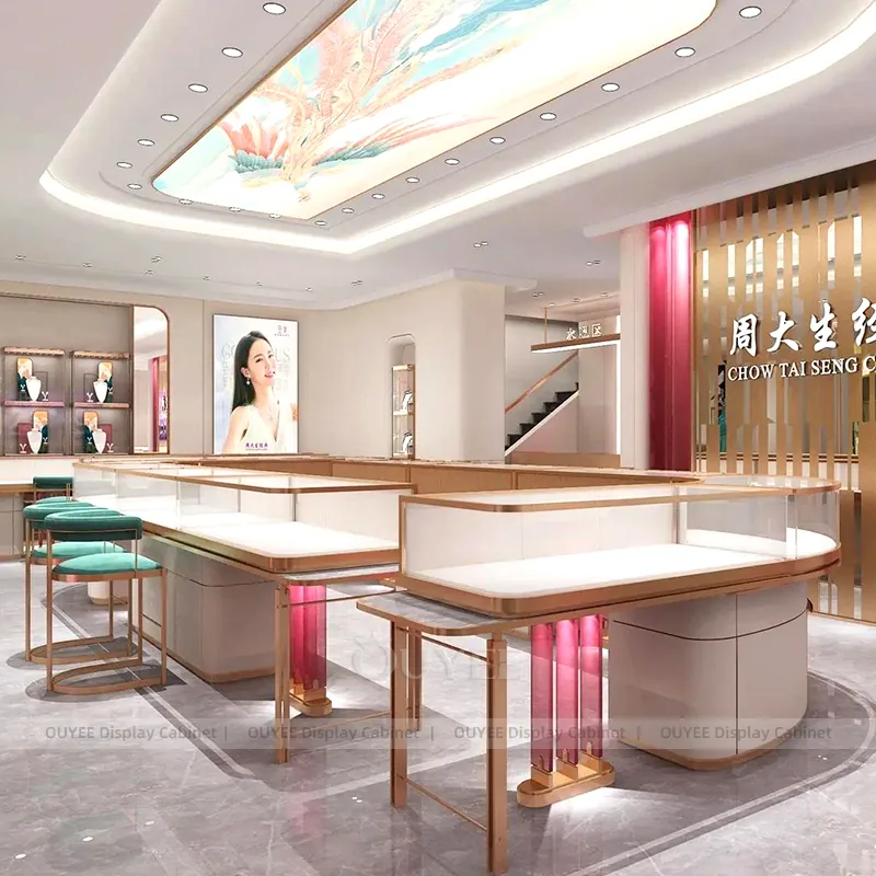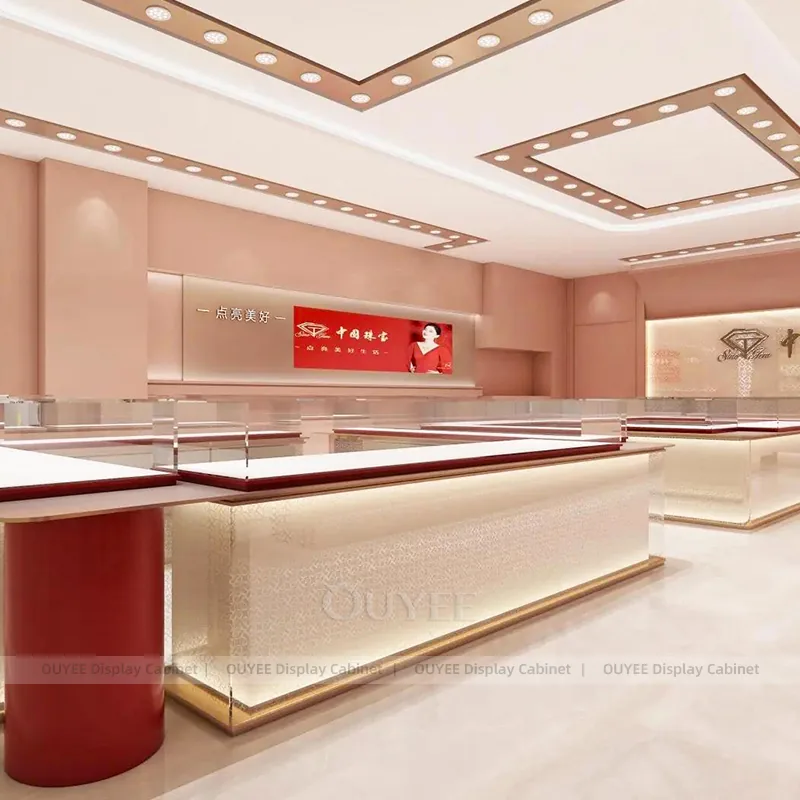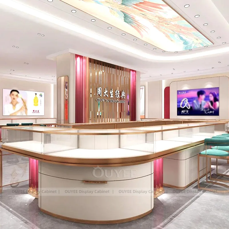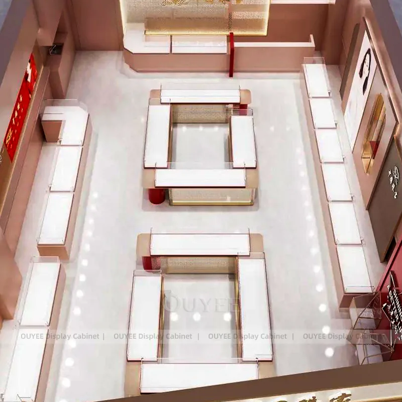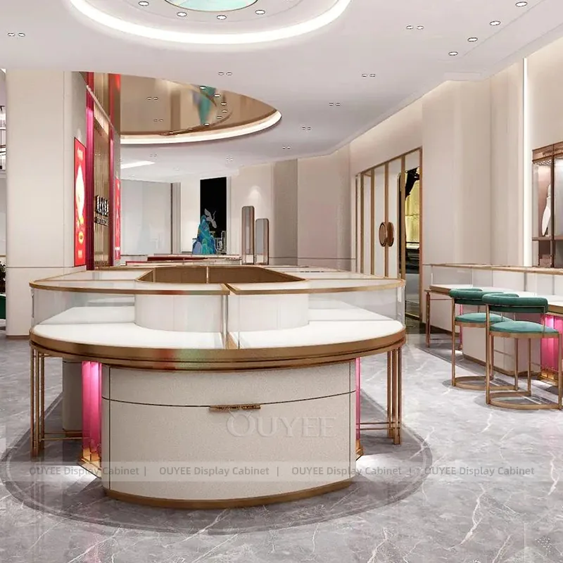 OUYEE can produce this model with tempered glass, champagne-gold metal trim, and custom jewelry fixture joinery. We can adjust dimensions, counter heights, storage details, showcase proportions, branding areas, and champagne-gold detailing so the project fits the store concept, SKU mix, and floor plan. Related inspiration is available across jewelry shop displays, display cases and our store fixture manufacturing service.