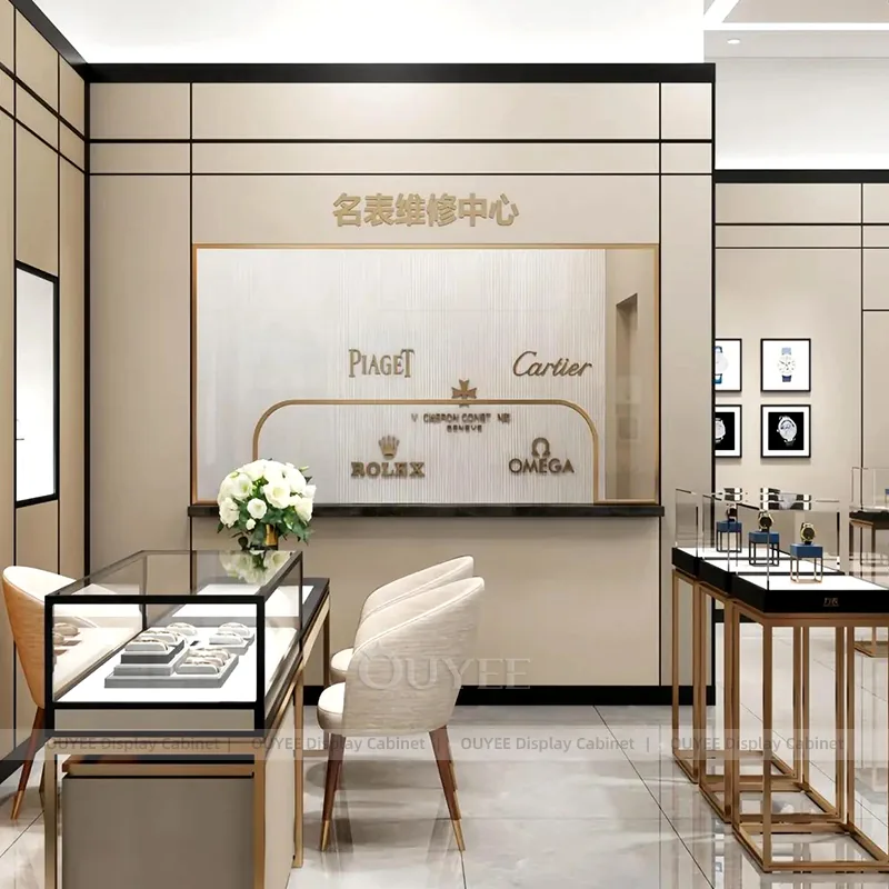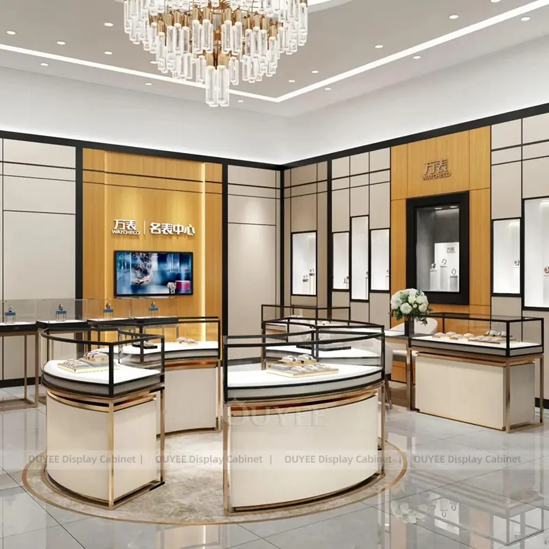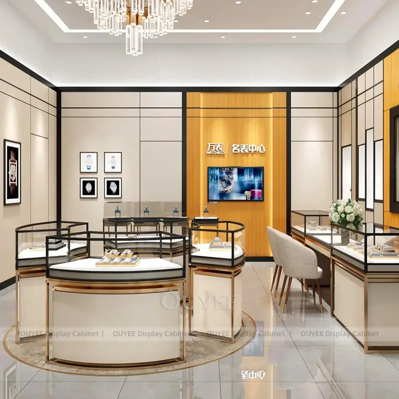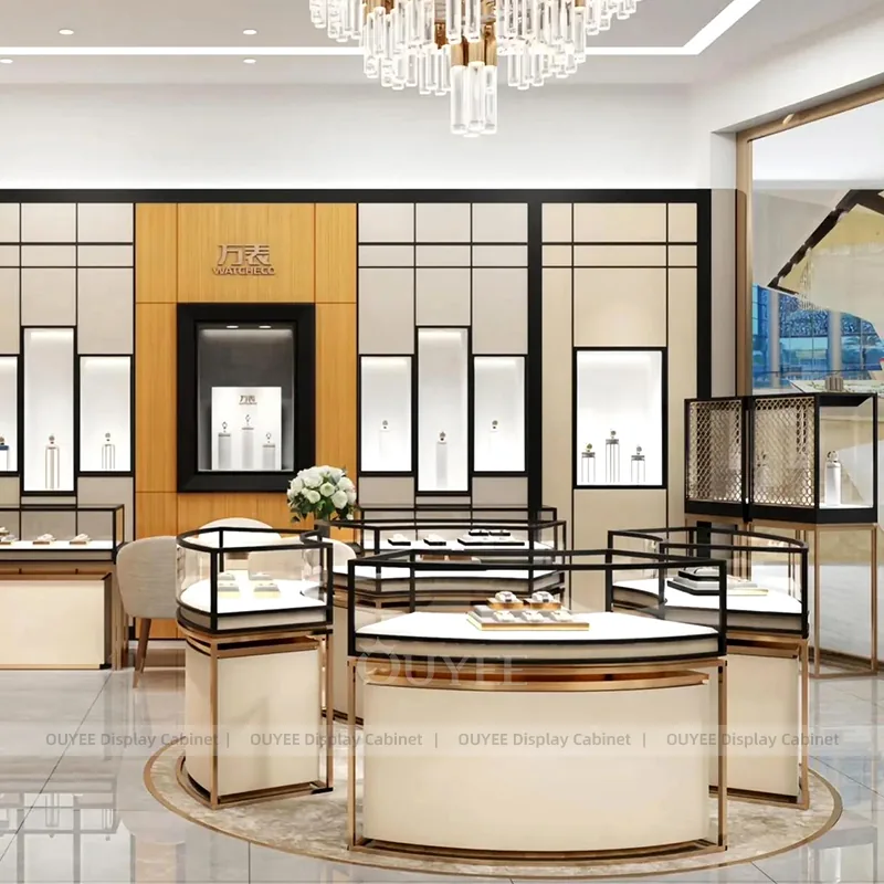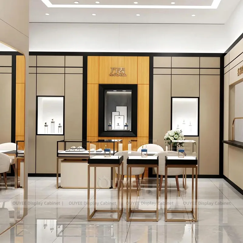 OUYEE can produce this model with tempered glass, fluted wood cladding, and custom jewelry fixture joinery. We can adjust dimensions, counter heights, storage details, showcase proportions, branding areas, and fluted wood textures so the project fits the store concept, SKU mix, and floor plan. Related inspiration is available across jewelry shop displays, display cases and our store fixture manufacturing service.