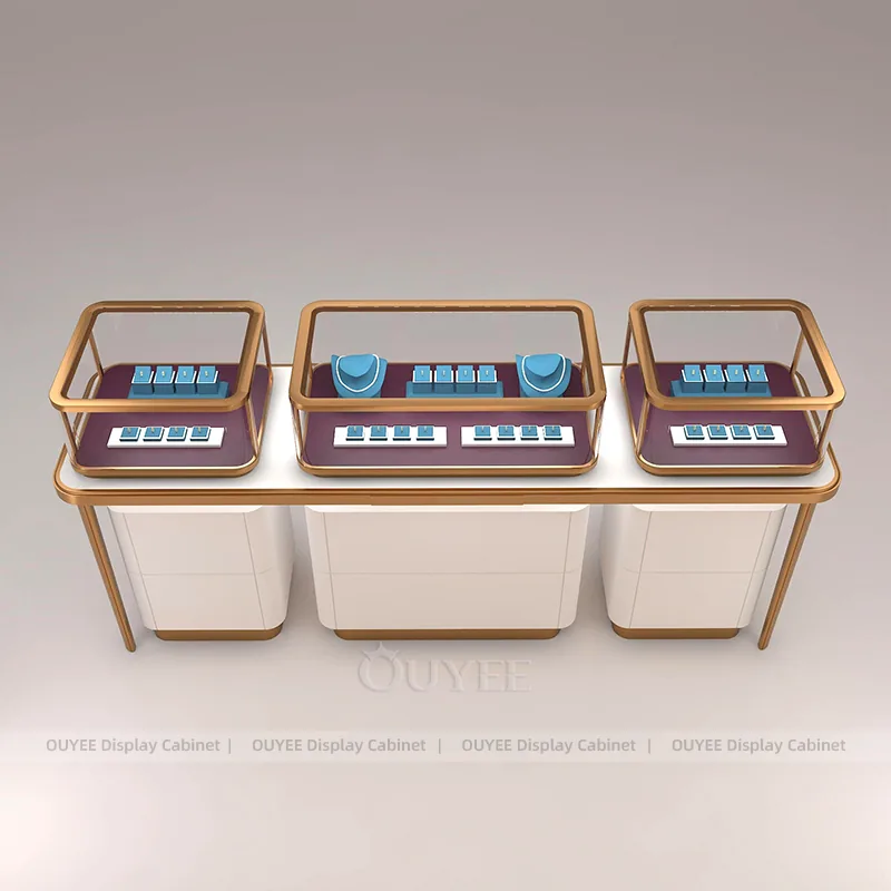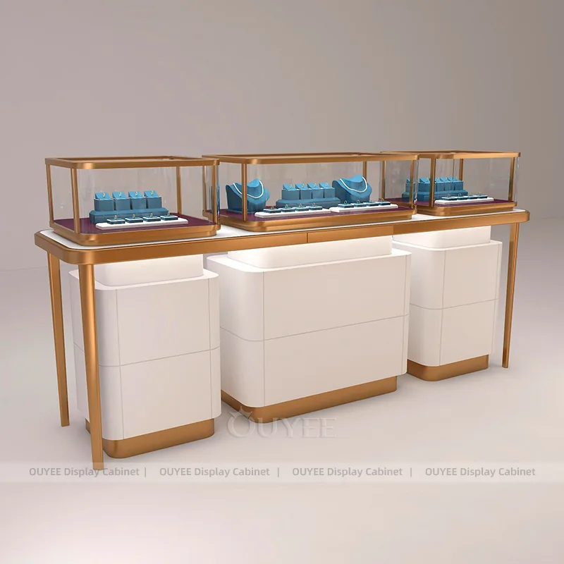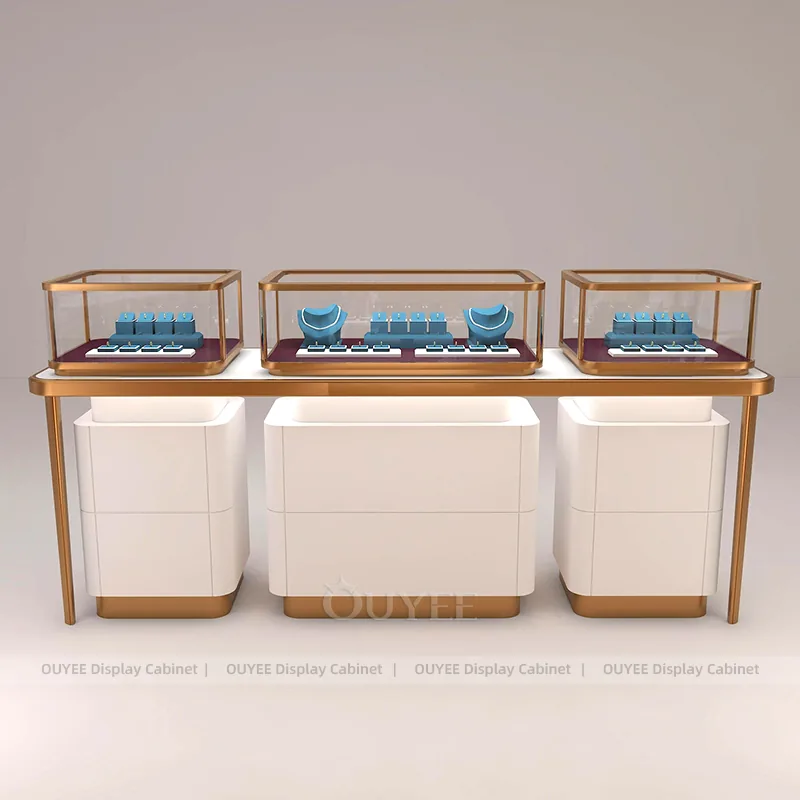 OUYEE can produce this model with tempered glass, fluted wood cladding, and custom jewelry fixture joinery. We can adjust dimensions, counter heights, storage details, showcase proportions, branding areas, and fluted wood textures so the project fits the store concept, SKU mix, and floor plan. Related inspiration is available across jewelry shop displays, display cabinet and our store fixture manufacturing service.