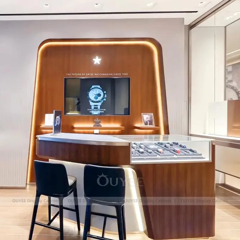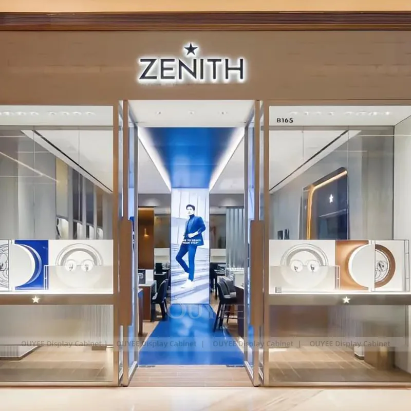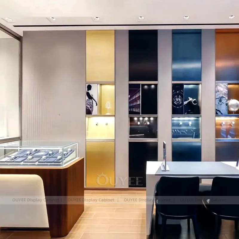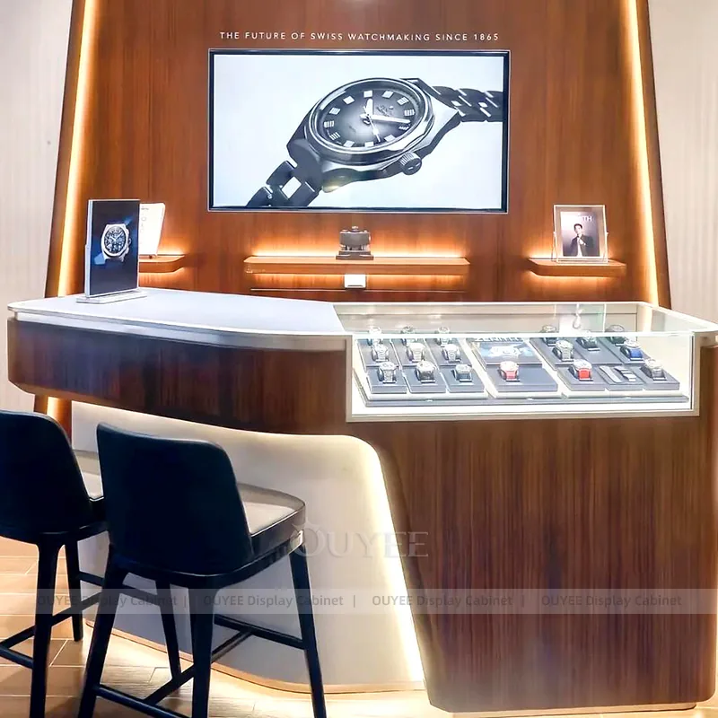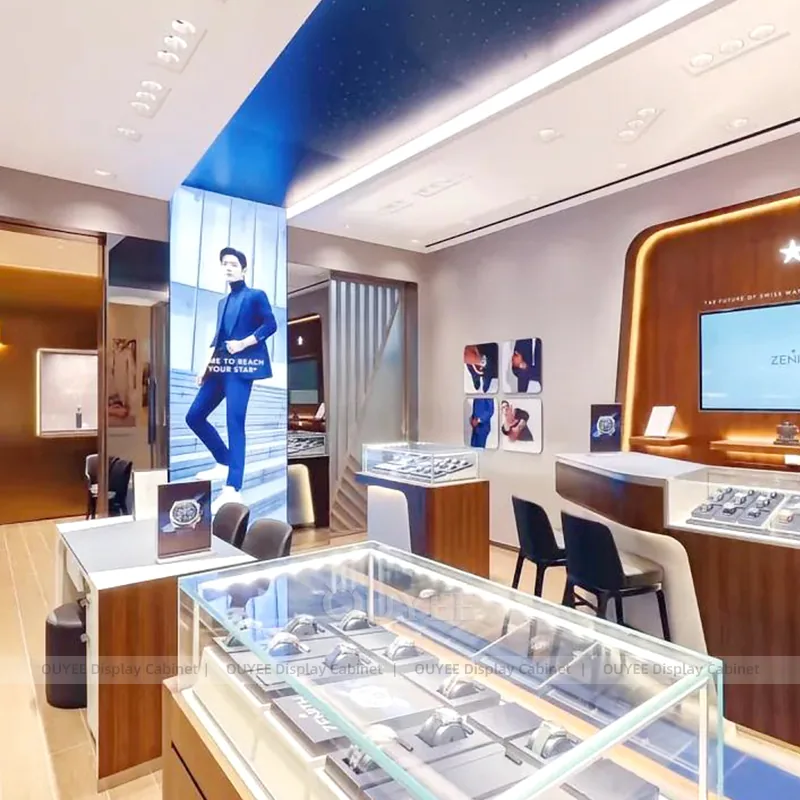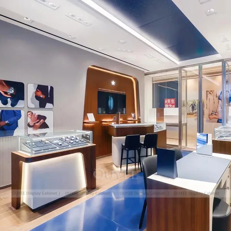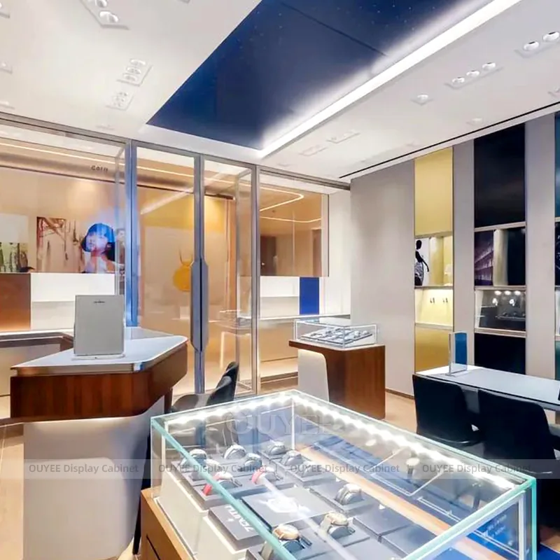OUYEE can produce this model with tempered glass, marble-look accent panels, and custom jewelry fixture joinery. We can adjust dimensions, counter heights, storage details, showcase proportions, branding areas, and marble-accent detailing so the project fits the store concept, SKU mix, and floor plan. Related inspiration is available across jewelry shop displays, display cases and our store fixture manufacturing service.