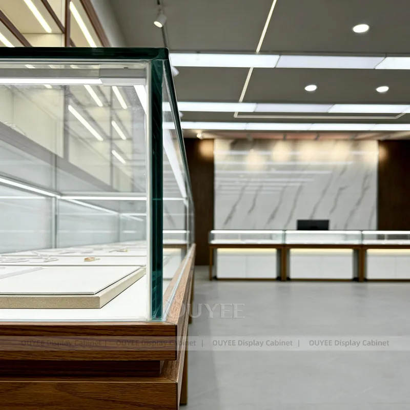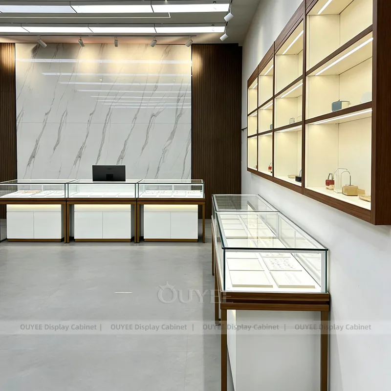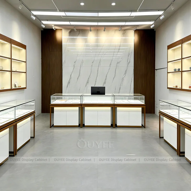 OUYEE can produce this model with tempered glass, lacquered display panels, and custom jewelry fixture joinery. We can adjust dimensions, counter heights, storage details, showcase proportions, branding areas, and clean white finishes so the project fits the store concept, SKU mix, and floor plan. Related inspiration is available across jewelry shop displays, display cabinet and our store fixture manufacturing service.