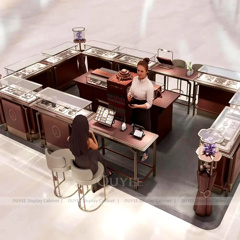 The fixture uses a counter-led jewelry layout that supports consultation, display clarity, and refined customer interaction. That supports smoother browsing, more disciplined visual merchandising, and better communication between display areas and consultation points in luxury jewelry retail.