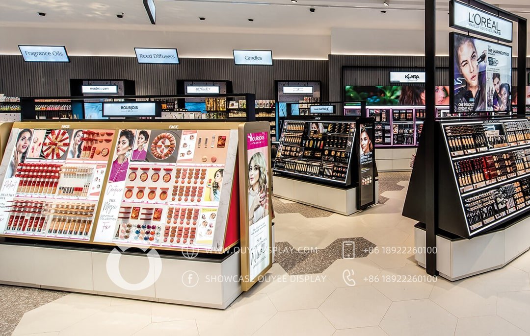 Guangzhou Ouyee Display manufacture high quality cosmetic shop and beauty supplies store fixtures, include the retail display shelf, makeup table, also come with light box and signs.