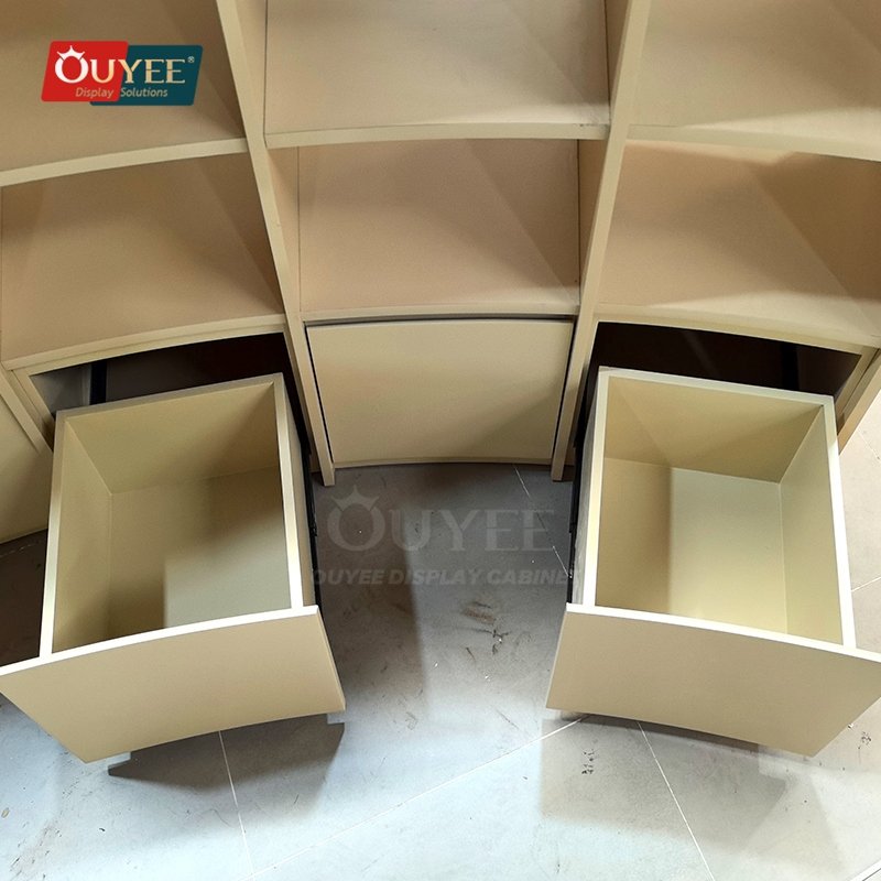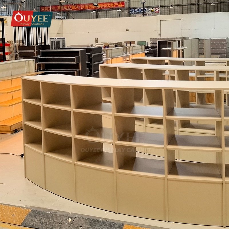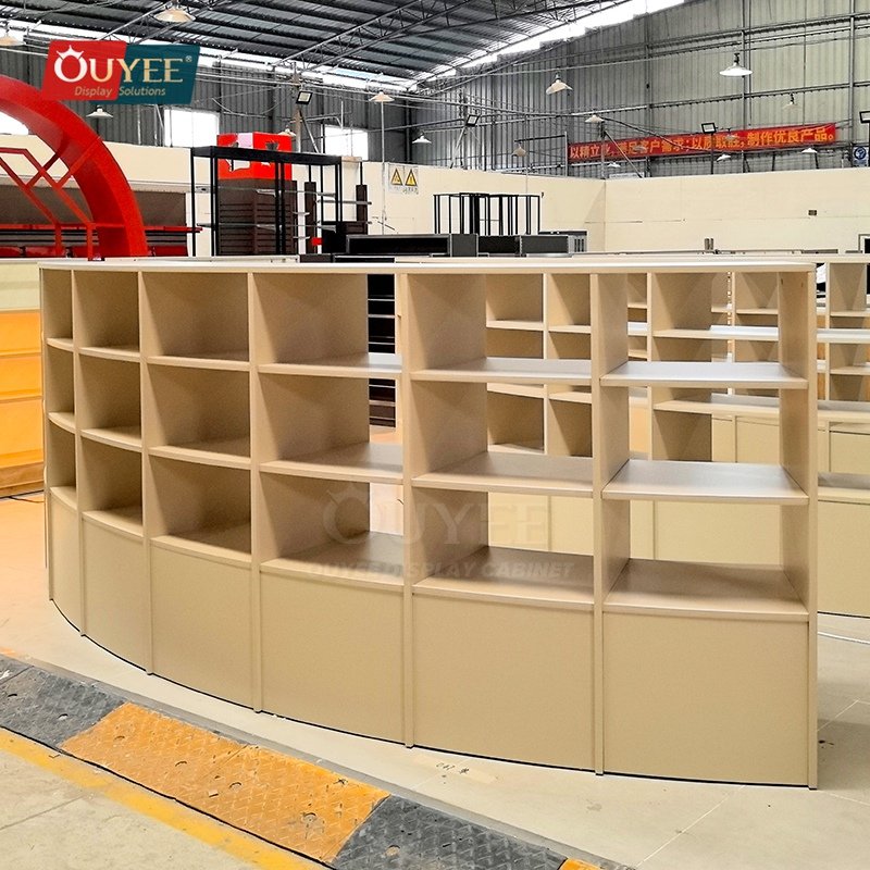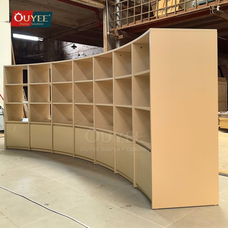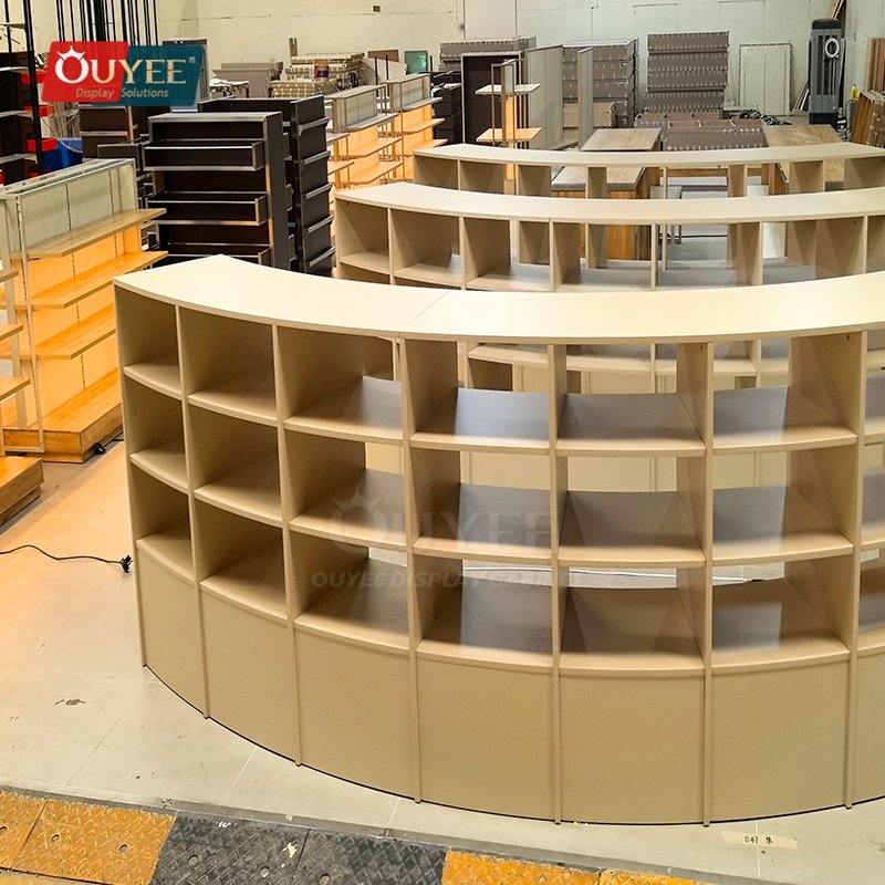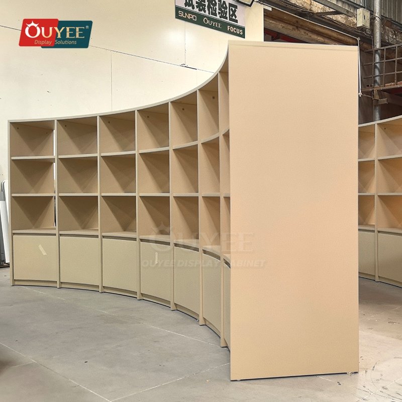 OUYEE develops Curved Beige Open Shelf Display Stand System for specialty retailers, boutiques, branded chain stores, and high-traffic merchandising environments. This display stand supports cleaner merchandising, stronger product focus, and flexible custom production for stores that need a more deliberate fixture language. For similar fixture references, you can visit our display shelves page, browse more store shelving displays, and review OUYEE production support on the manufacturing and materials pages.