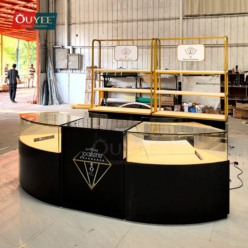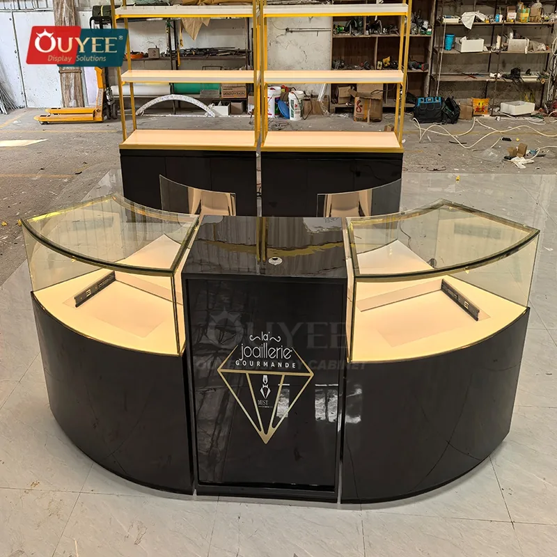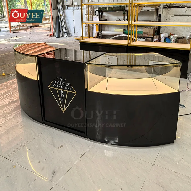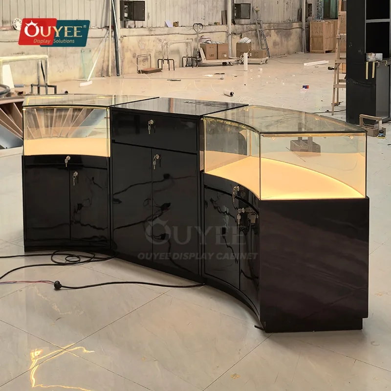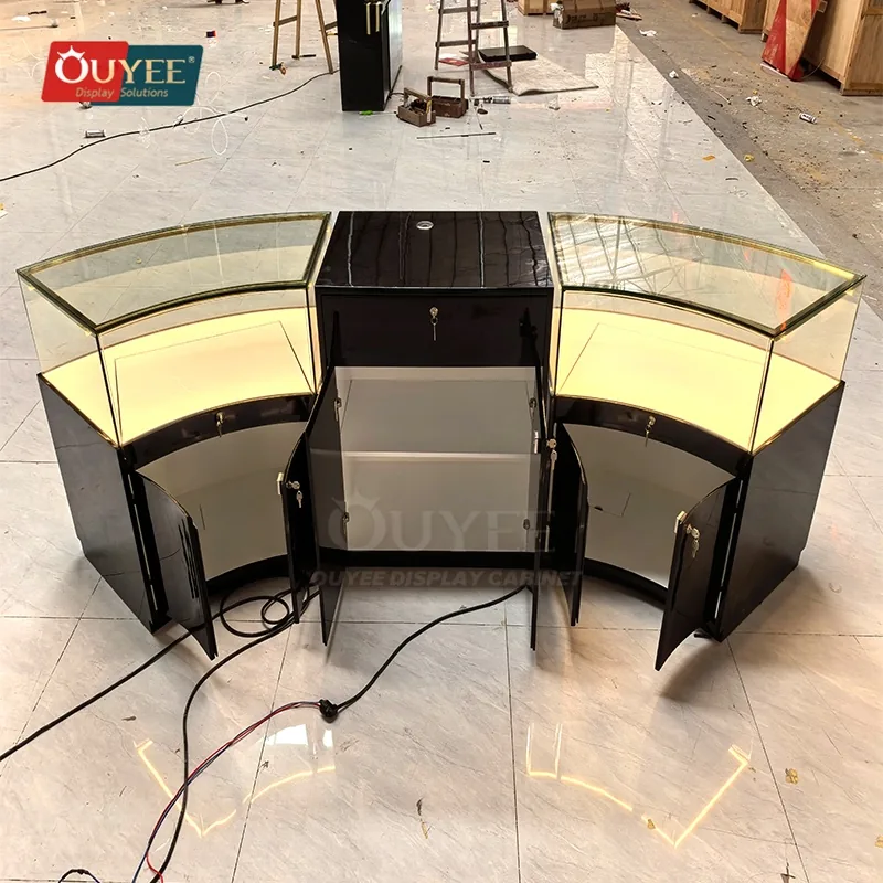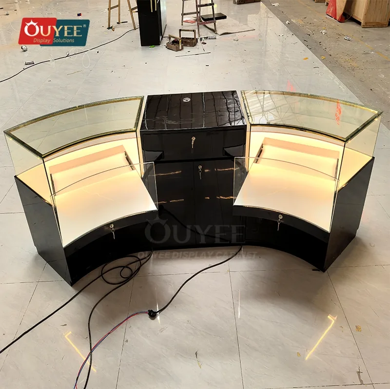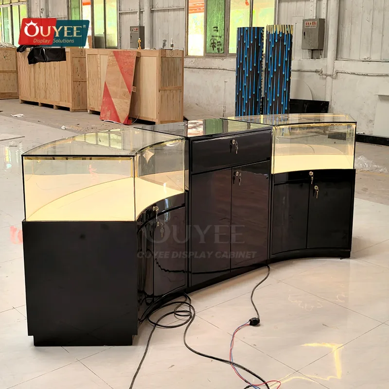 OUYEE develops Curved Wood Grain Glass Showcase Island with Rounded Corners for shopping mall stores, boutique floor plans, promotional zones, and center merchandising areas. This glass showcase supports protected presentation, stronger product focus, and custom fixture production for premium retail projects. For matching showcase references, you can explore our display cabinet page, browse display cases, and review OUYEE support on the manufacturing and materials pages.