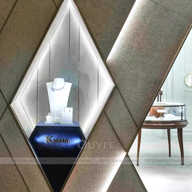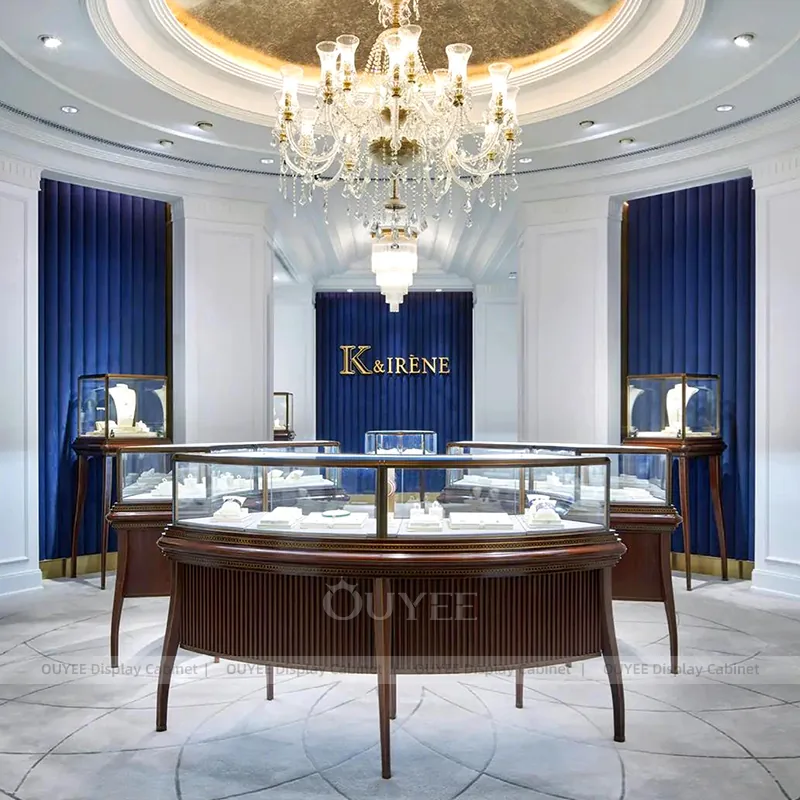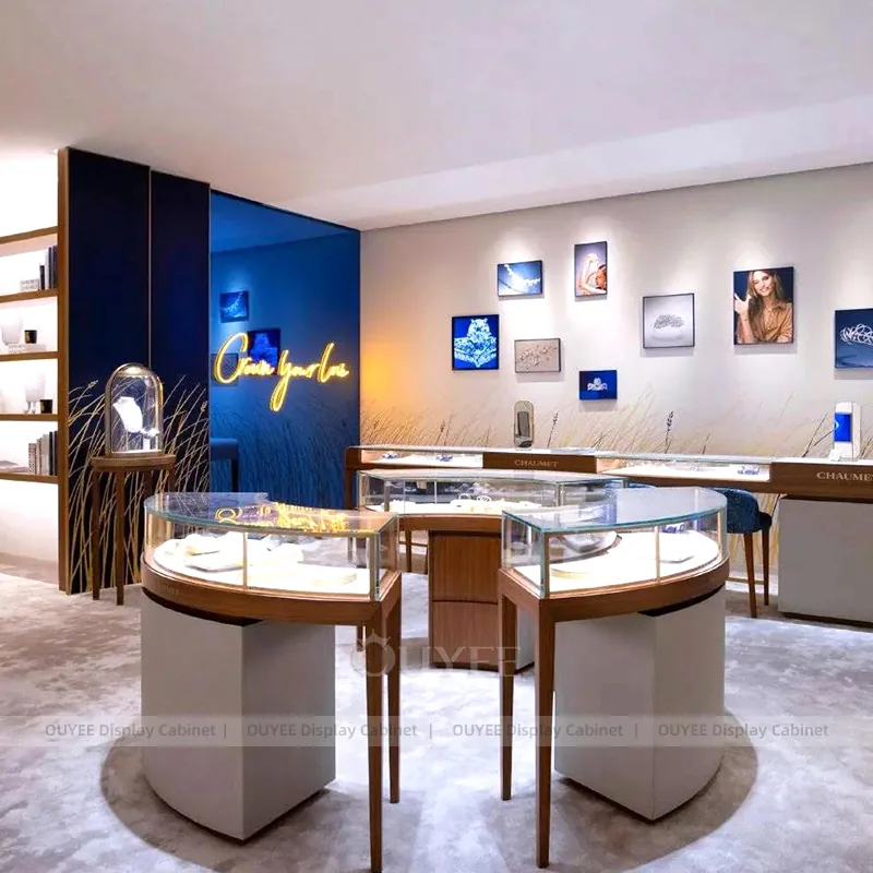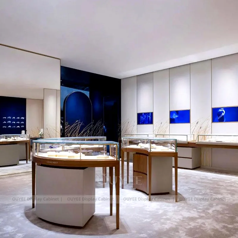 OUYEE can produce this model with tempered glass, lacquered display panels, and custom jewelry fixture joinery. We can adjust dimensions, counter heights, storage details, showcase proportions, branding areas, and warm beige finishes so the project fits the store concept, SKU mix, and floor plan. Related inspiration is available across jewelry shop displays, display cabinet and our store fixture manufacturing service.