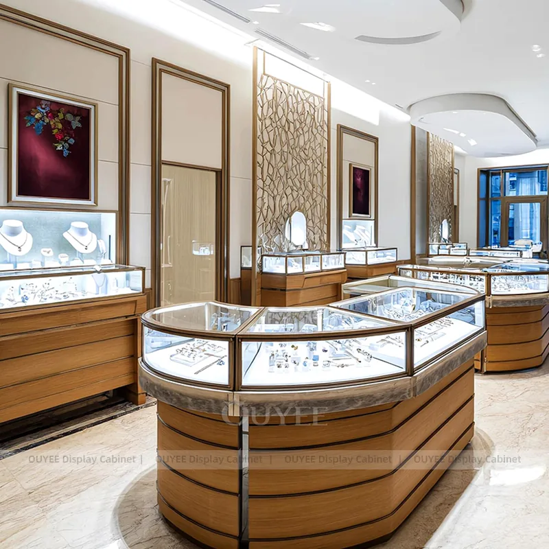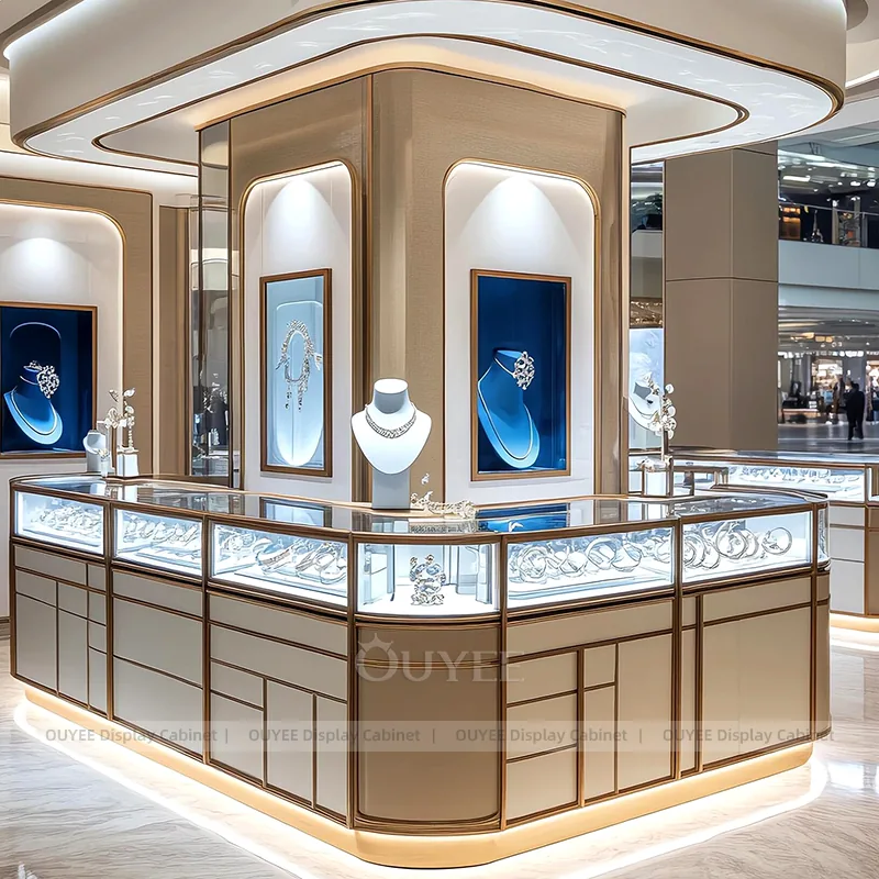 OUYEE can produce this model with tempered glass, lacquered display panels, and custom jewelry fixture joinery. We can adjust dimensions, counter heights, storage details, showcase proportions, branding areas, and warm beige finishes so the project fits the store concept, SKU mix, and floor plan. Related inspiration is available across jewelry shop displays, display cases and our store fixture manufacturing service.