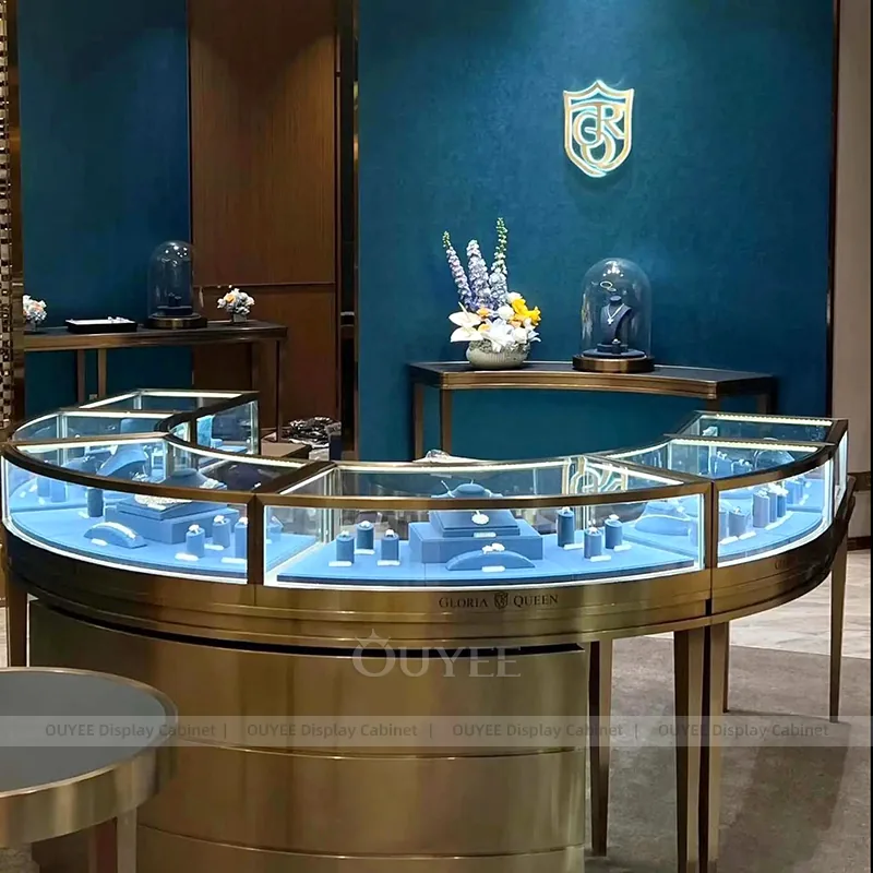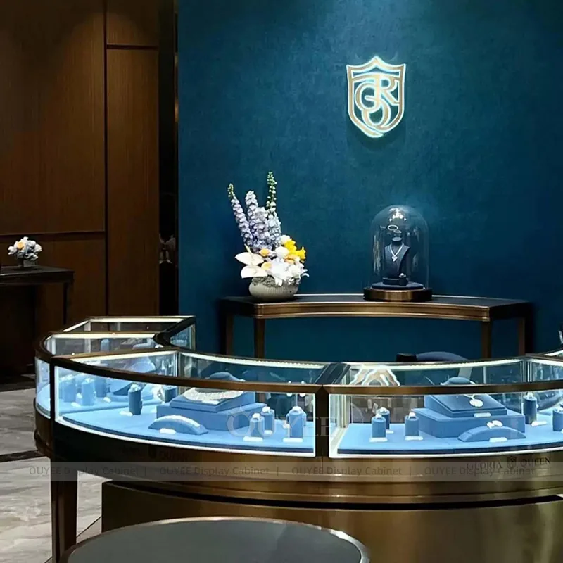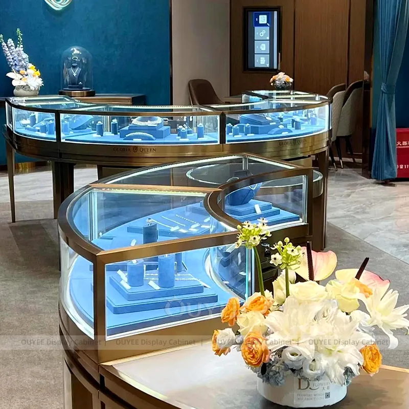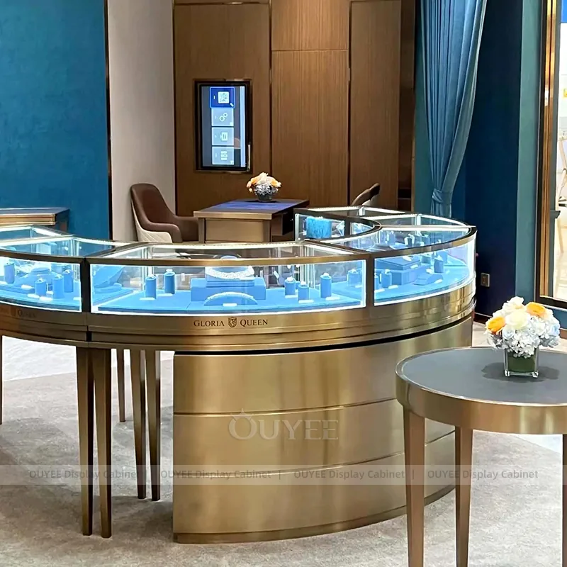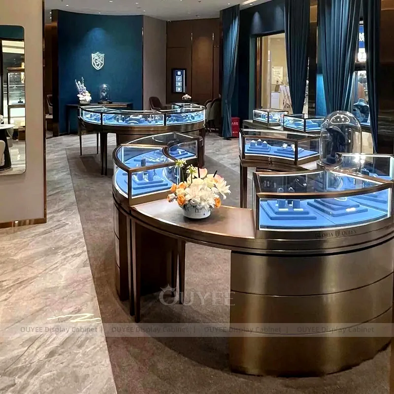 OUYEE can produce this model with tempered glass, lacquered display panels, and custom jewelry fixture joinery. We can adjust dimensions, counter heights, storage details, showcase proportions, branding areas, and soft cream finishes so the project fits the store concept, SKU mix, and floor plan. Related inspiration is available across jewelry shop displays, display cabinet and our store fixture manufacturing service.