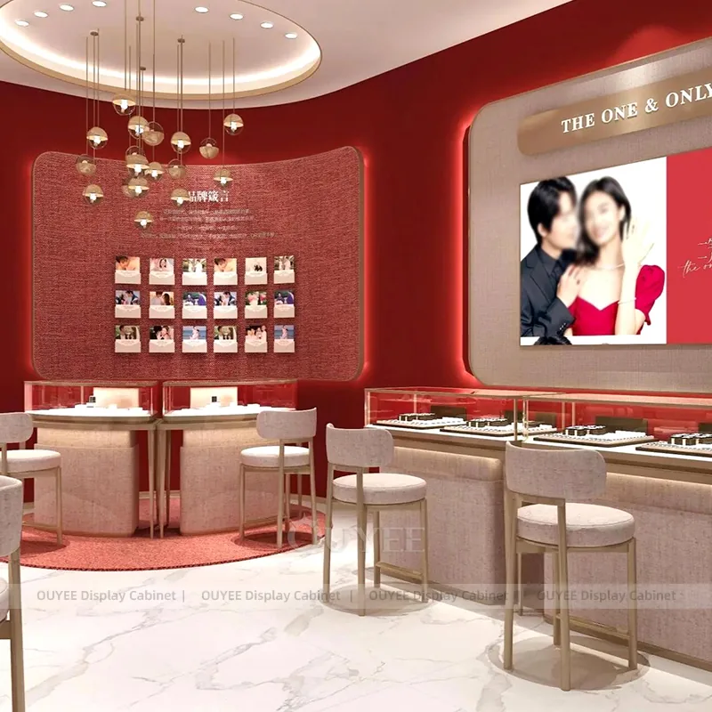 OUYEE can produce this model with tempered glass, lacquered display panels, and custom jewelry fixture joinery. We can adjust dimensions, counter heights, storage details, showcase proportions, branding areas, and soft cream finishes so the project fits the store concept, SKU mix, and floor plan. Related inspiration is available across jewelry shop displays, display cabinet and our store fixture manufacturing service.