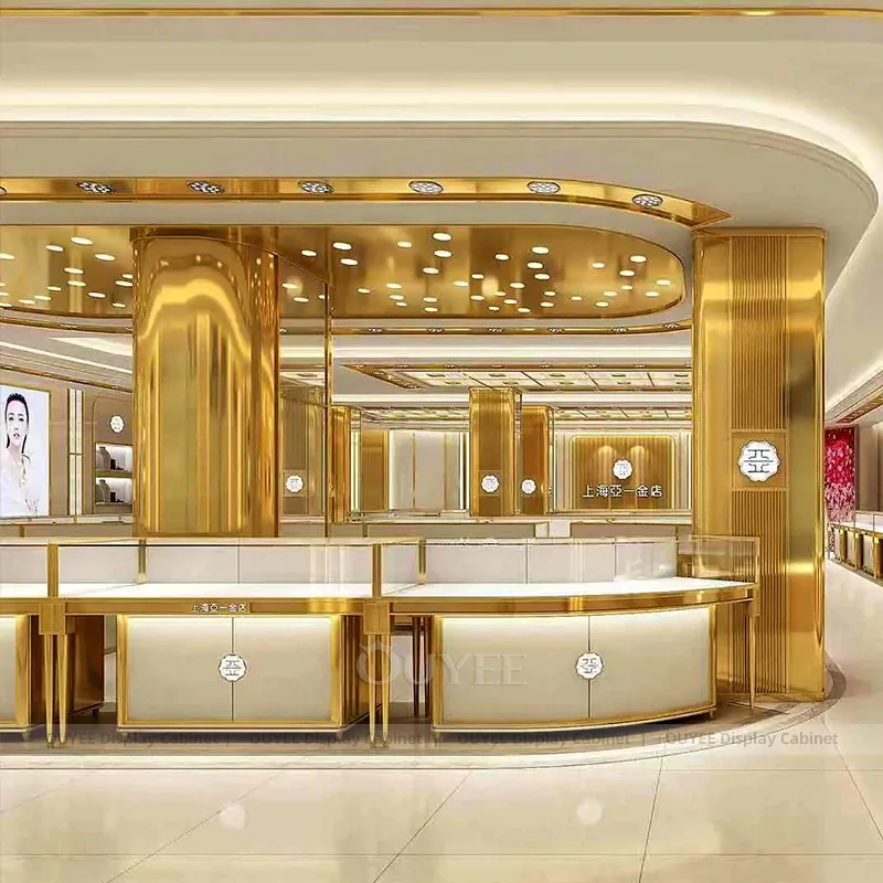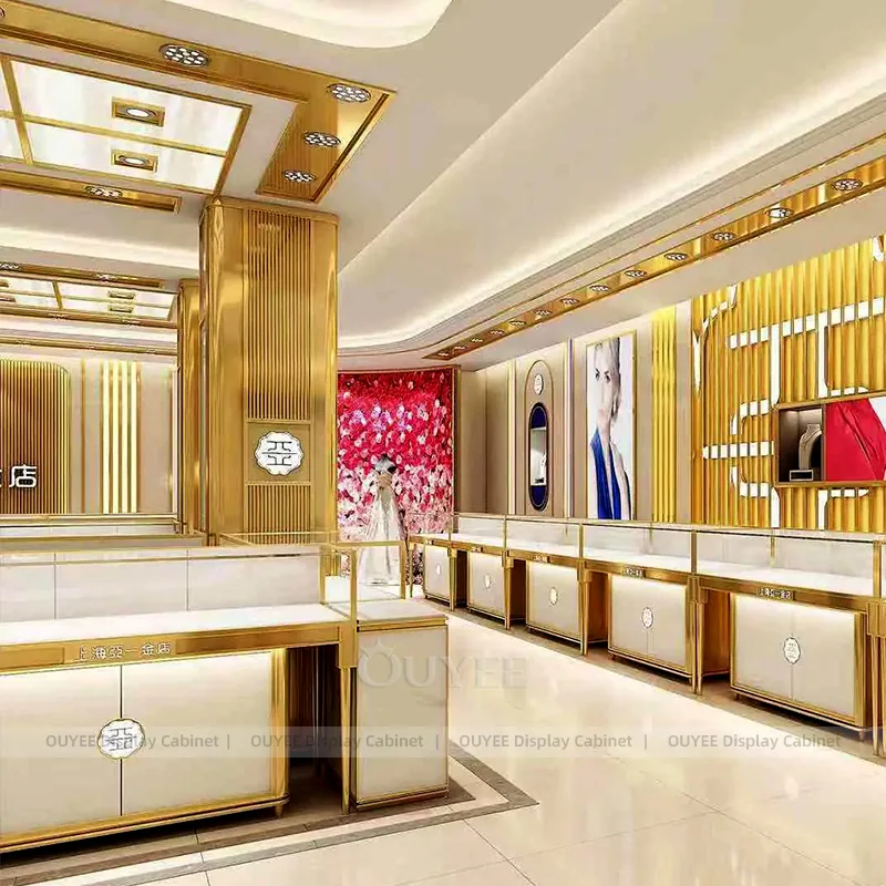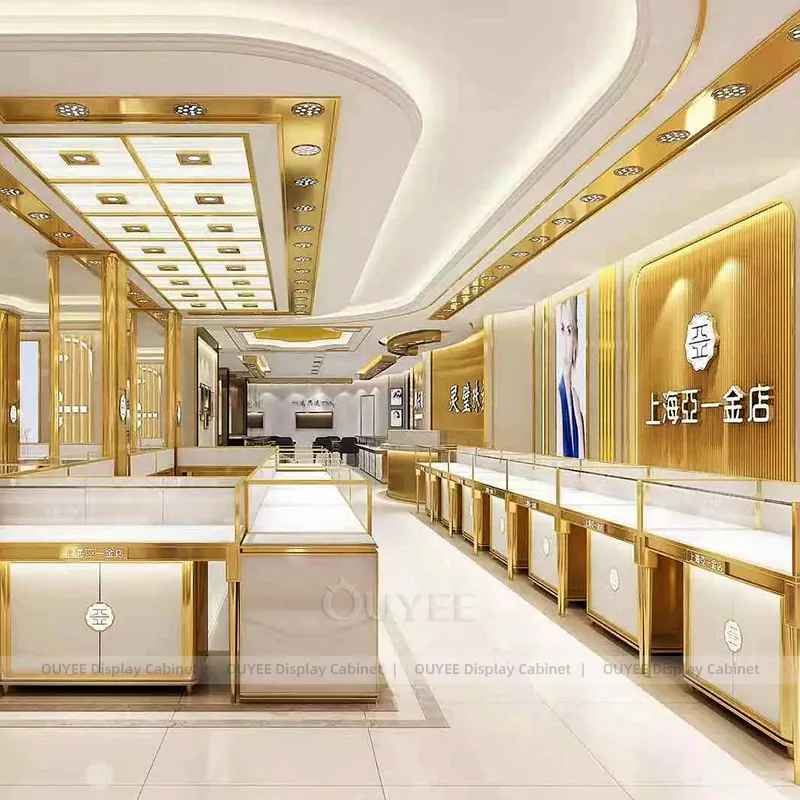 OUYEE can produce this model with tempered glass, lacquered display panels, and custom jewelry fixture joinery. We can adjust dimensions, counter heights, storage details, showcase proportions, branding areas, and soft cream finishes so the project fits the store concept, SKU mix, and floor plan. Related inspiration is available across jewelry shop displays, display cases and our store fixture manufacturing service.