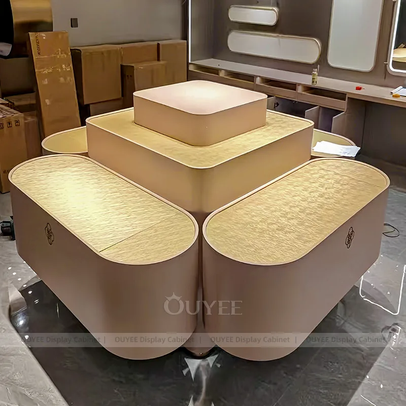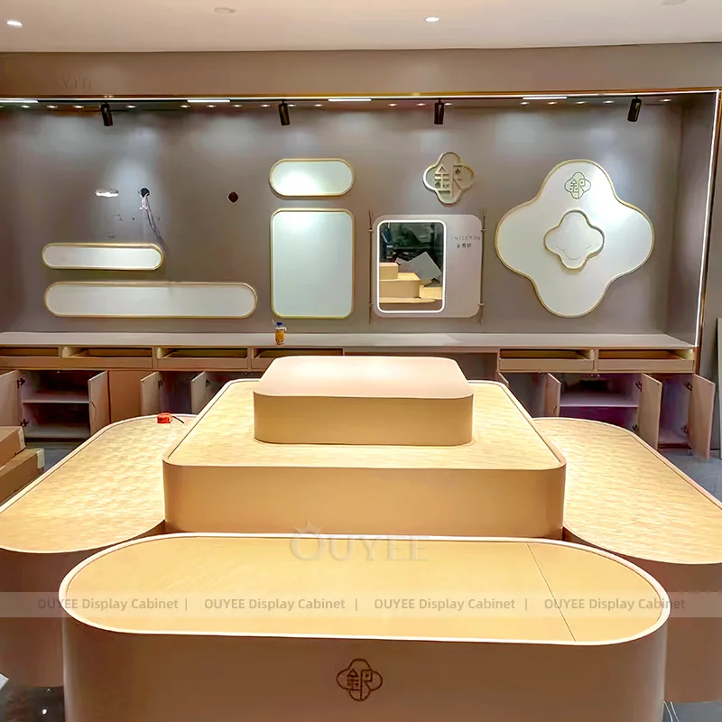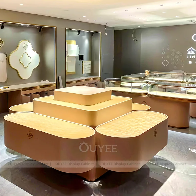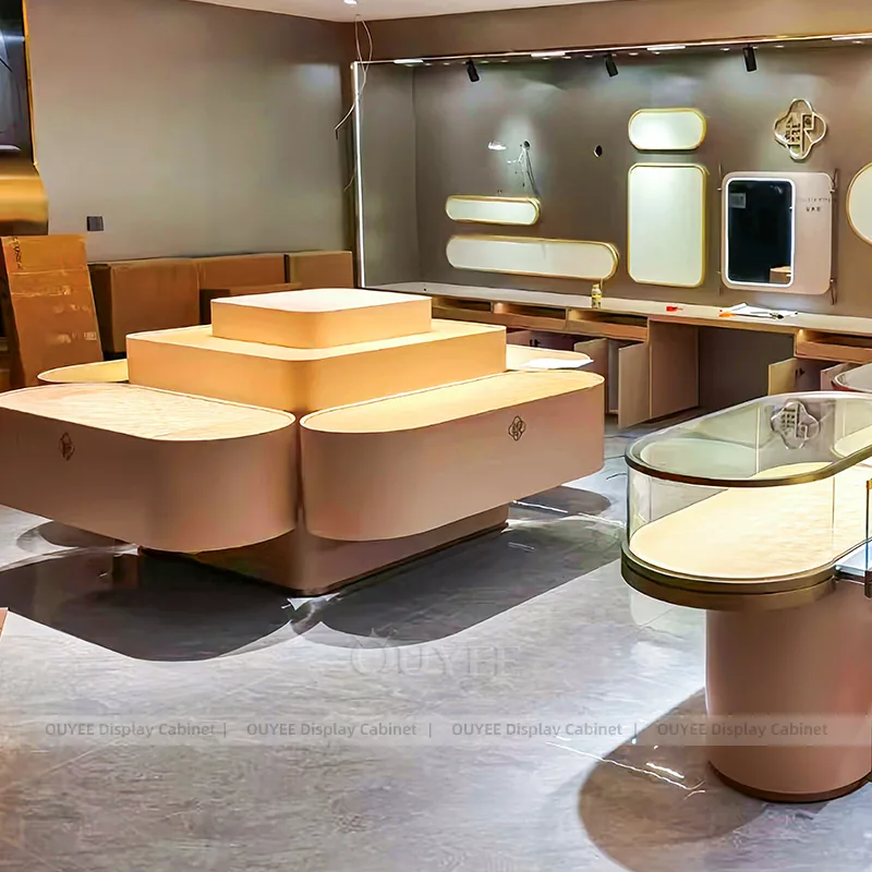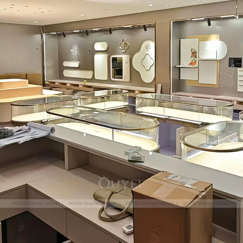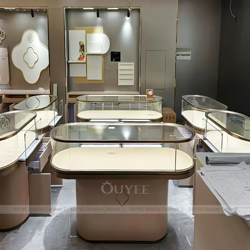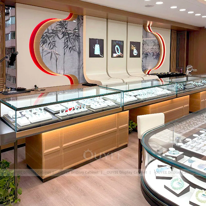 OUYEE can produce this model with tempered glass, marble-look accent panels, and custom jewelry fixture joinery. We can adjust dimensions, counter heights, storage details, showcase proportions, branding areas, and marble-accent detailing so the project fits the store concept, SKU mix, and floor plan. Related inspiration is available across jewelry shop displays, display cabinet and our store fixture manufacturing service.