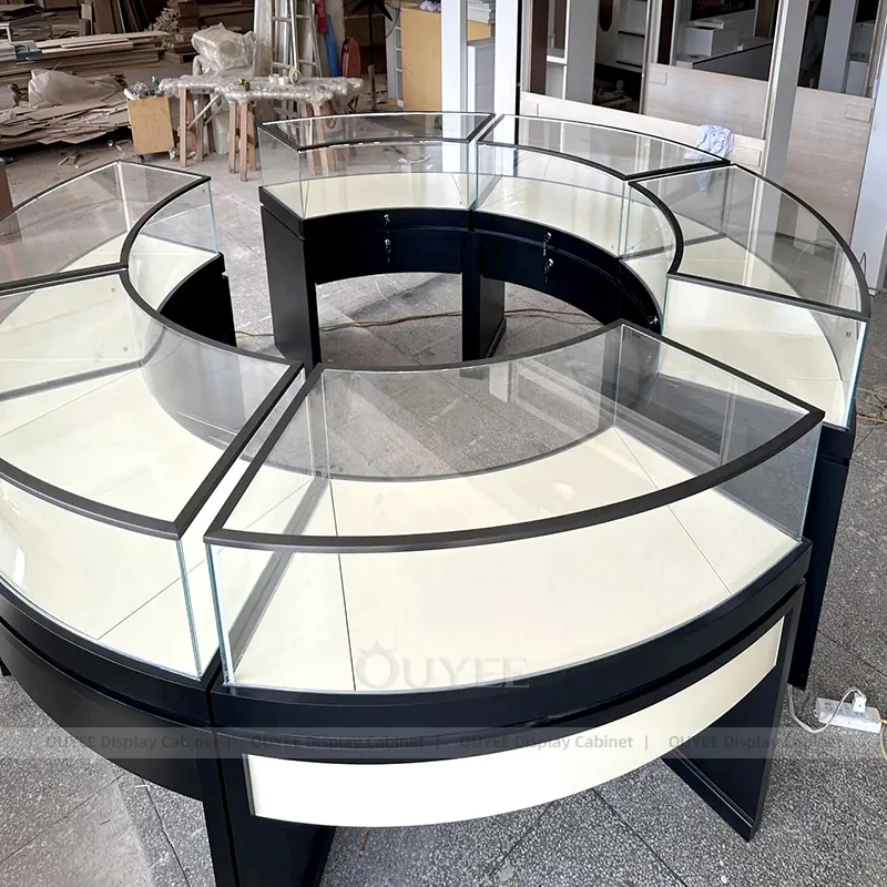 OUYEE can produce this model with tempered glass, marble-look accent panels, and custom jewelry fixture joinery. We can adjust dimensions, counter heights, storage details, showcase proportions, branding areas, and marble-accent detailing so the project fits the store concept, SKU mix, and floor plan. Related inspiration is available across jewelry shop displays, display cases and our store fixture manufacturing service.